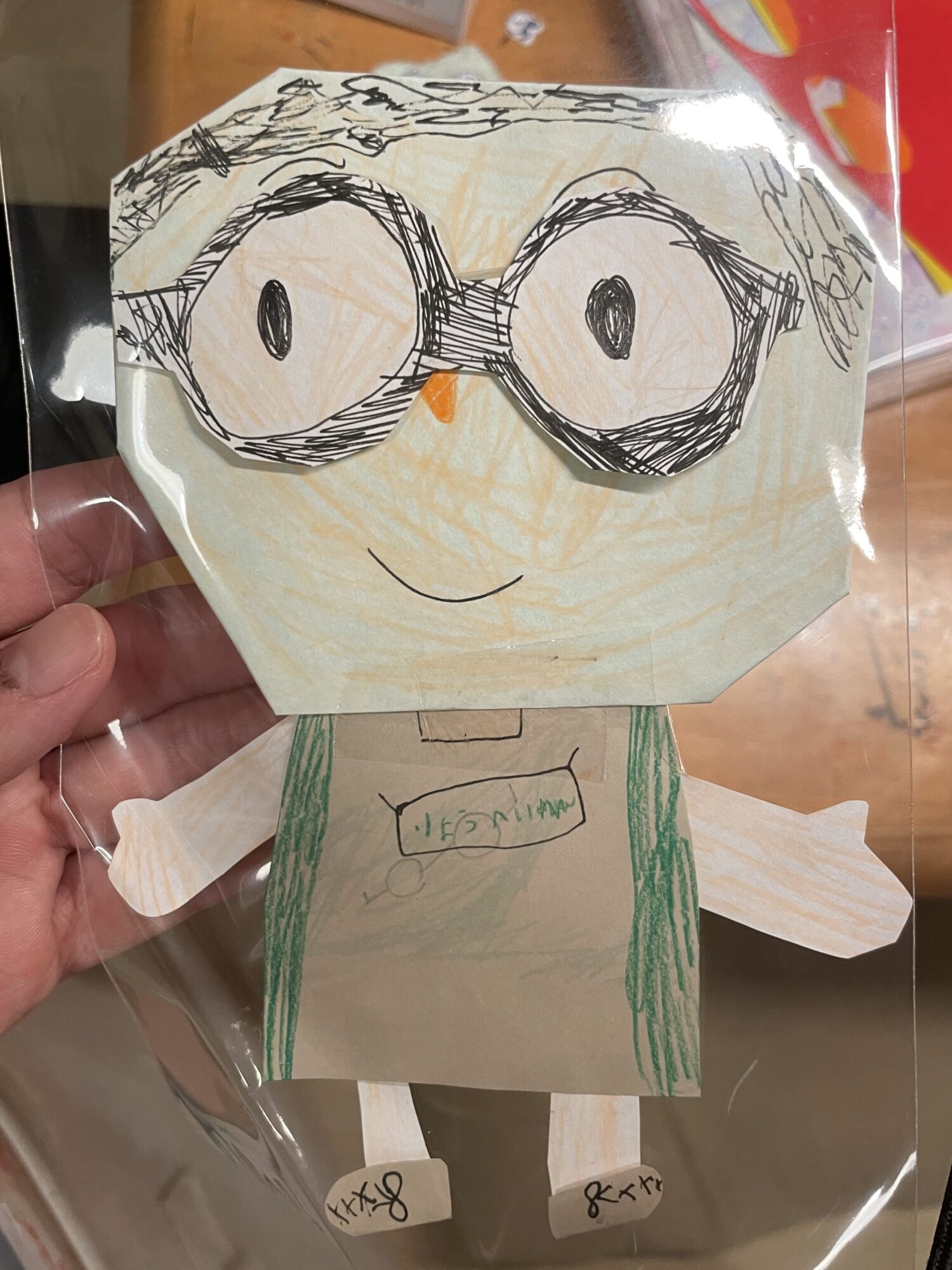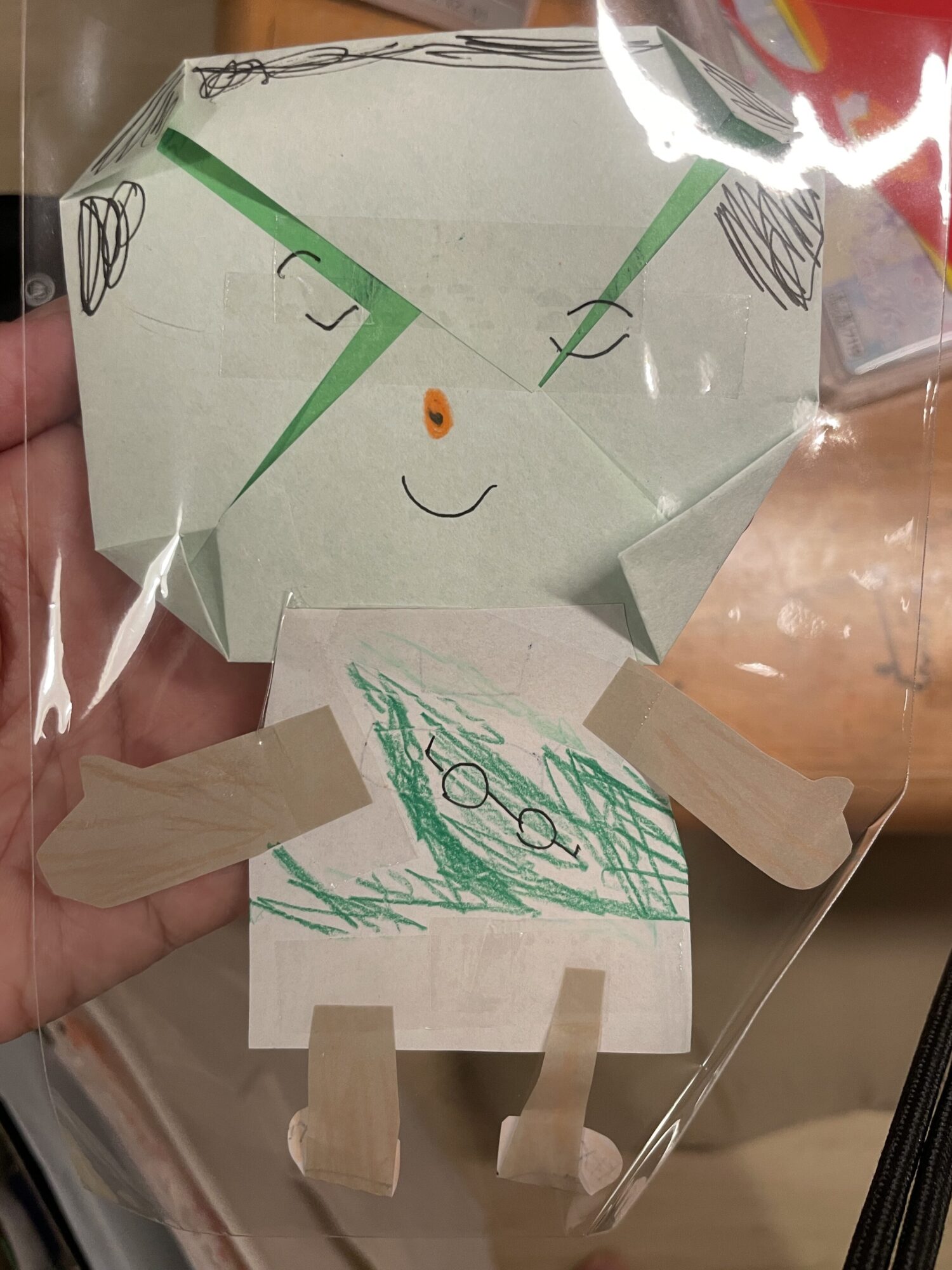 折り紙で作ったものは別の教室に異動されるりょうへい先生です。