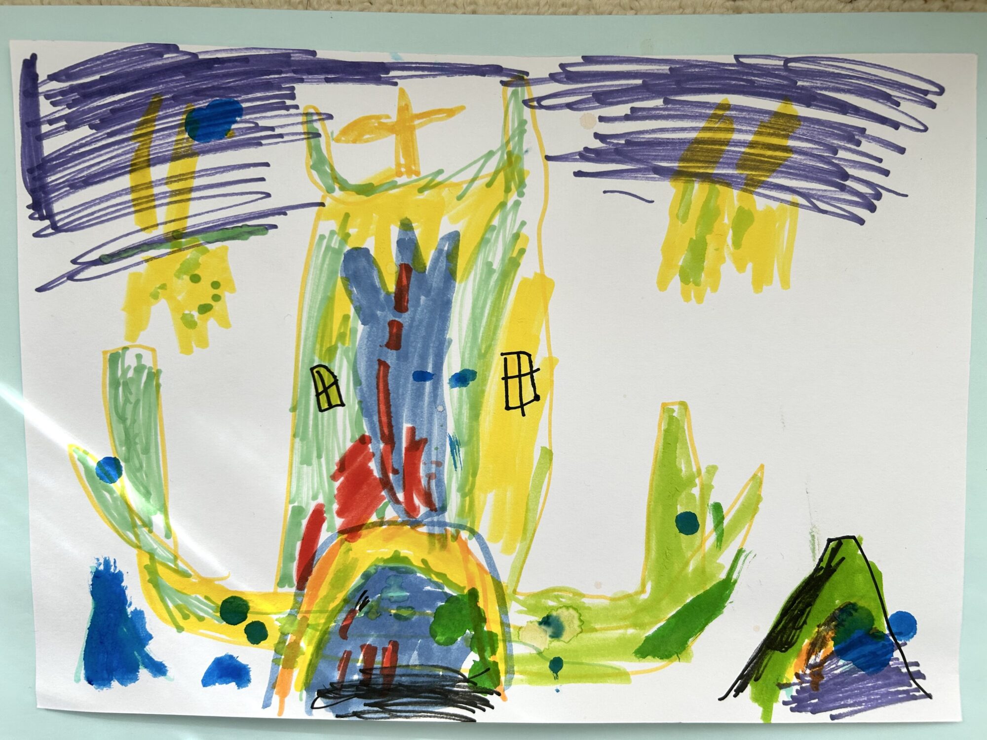 うごきたい!ほんとは、うごきまわりたい!!つよいびるのエネルギーをかんじるおえかきですね!!みぎがわの さんかくはなんだろう~♪