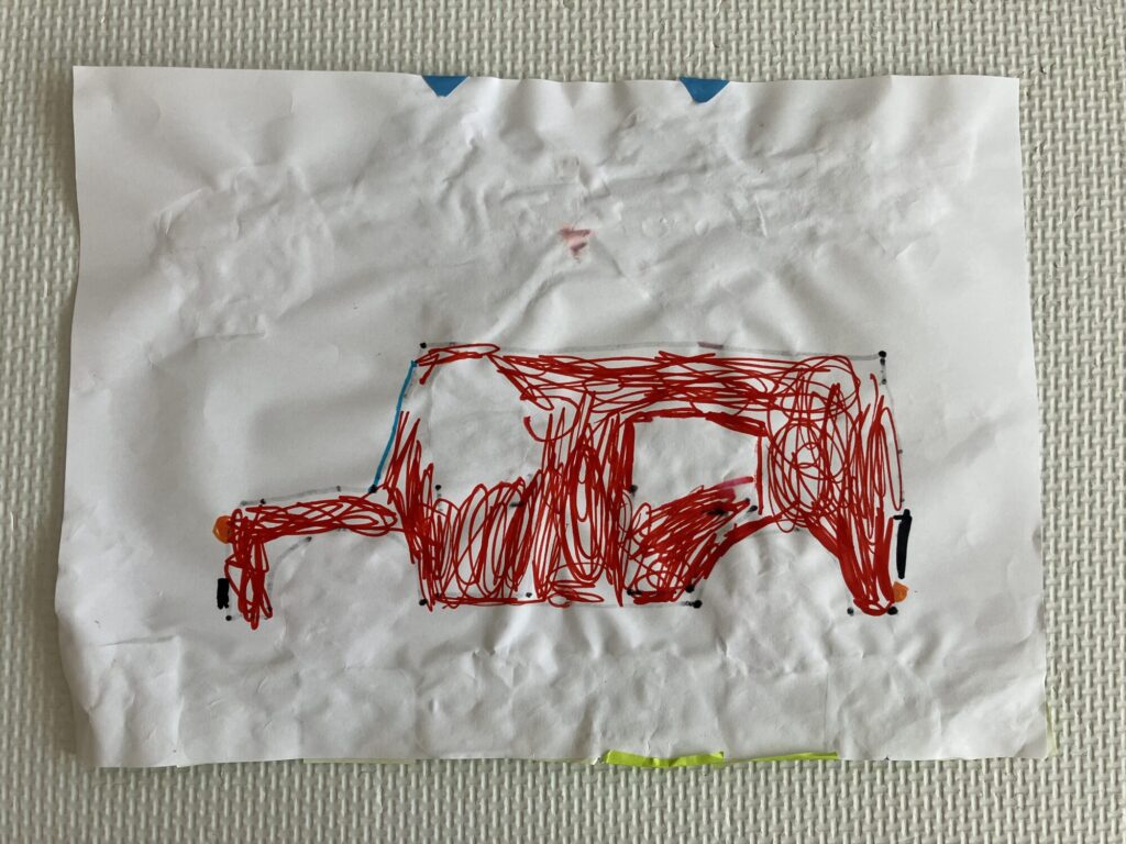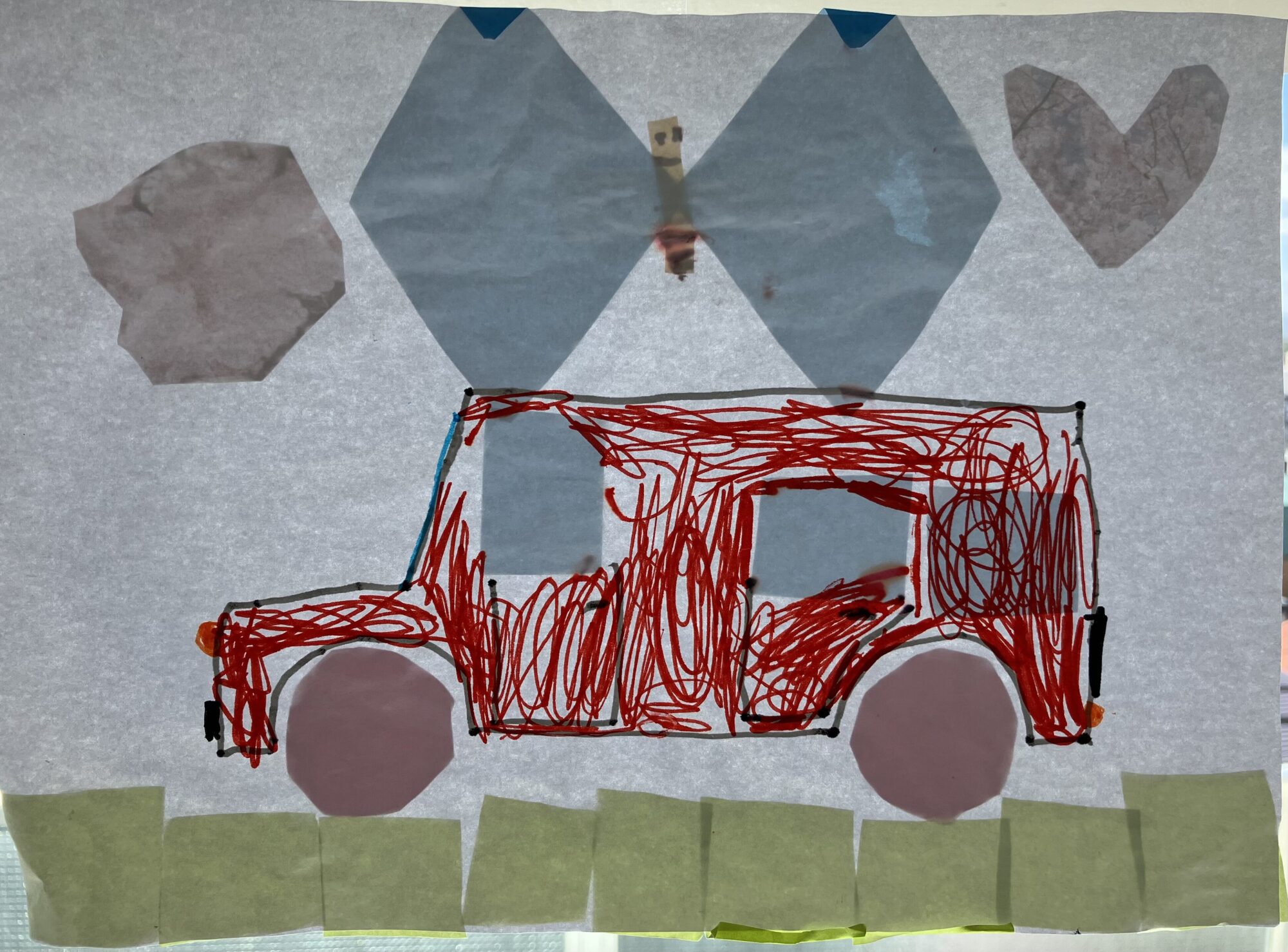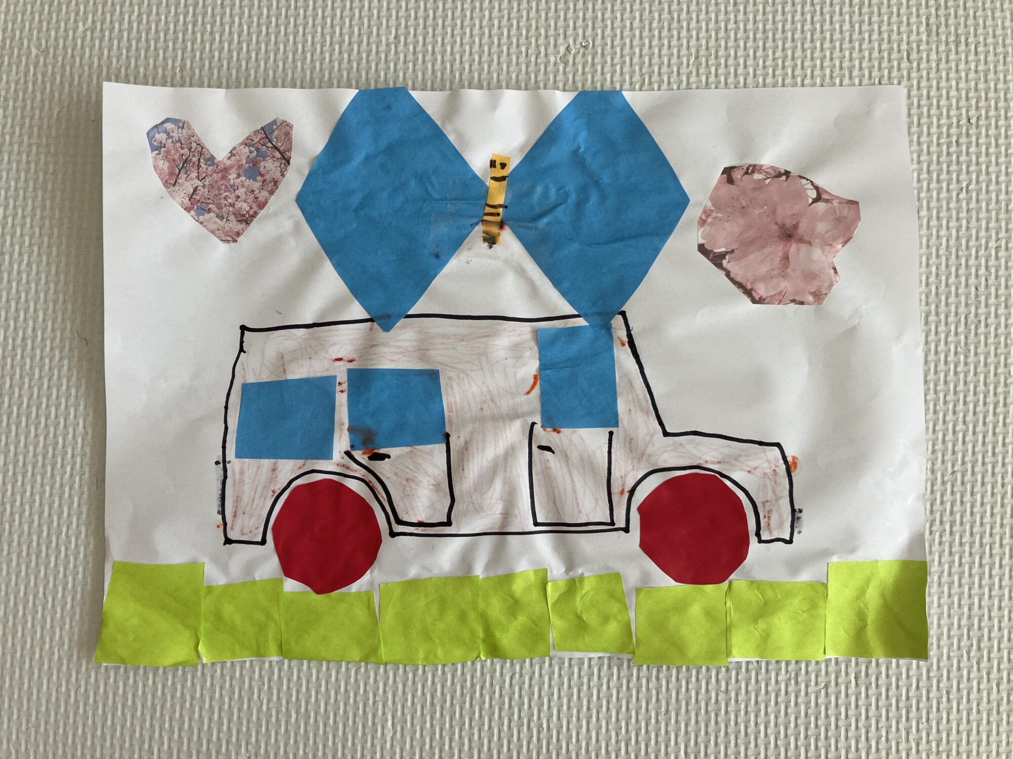 大好きな車の上を、蝶が舞っています。ハートをお花がプリントされた折り紙で作ったのがポイントのようです。