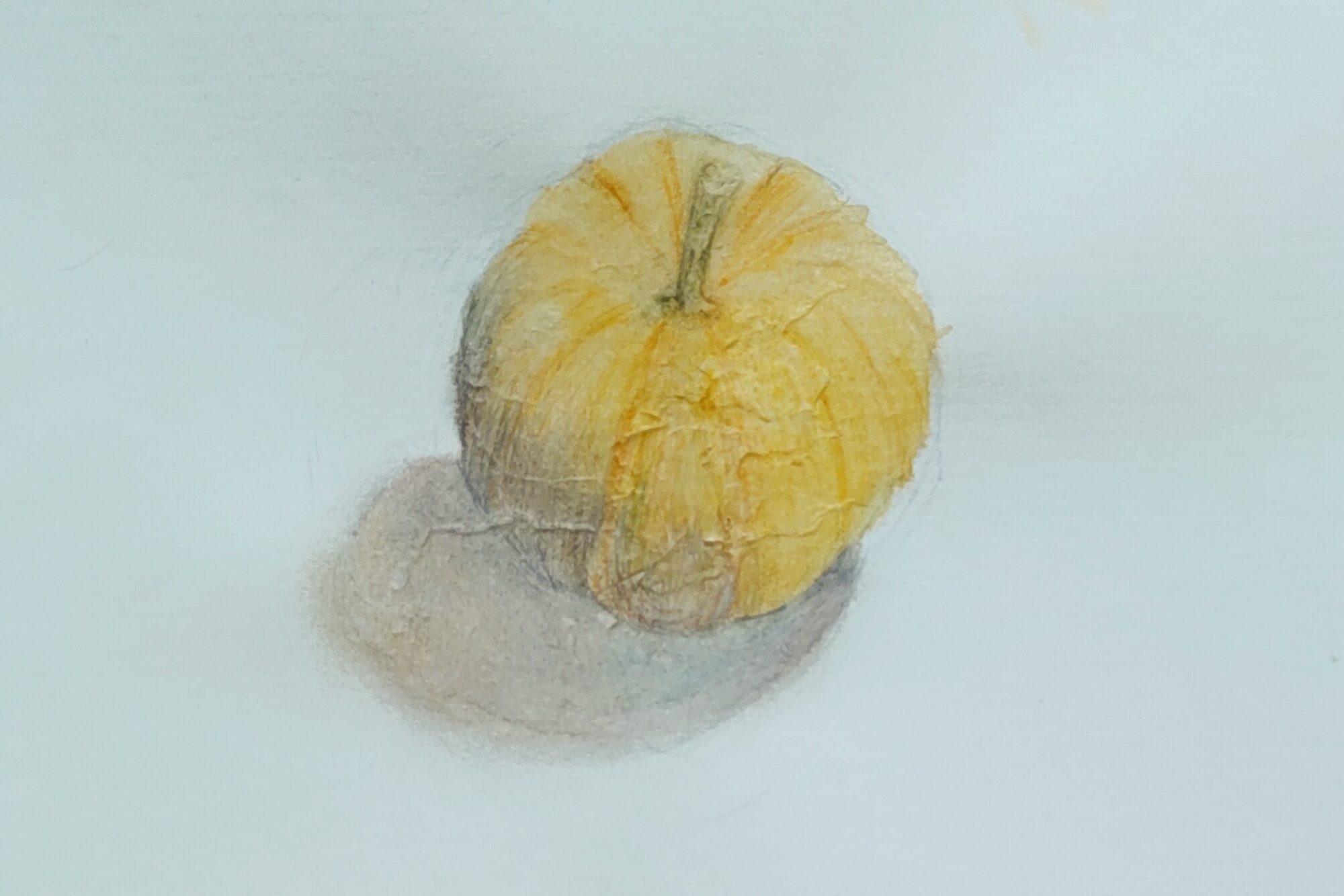 かぼちゃの影と、かぼちゃが置いてある面に落ちる影をしっかり描き分けてますね!