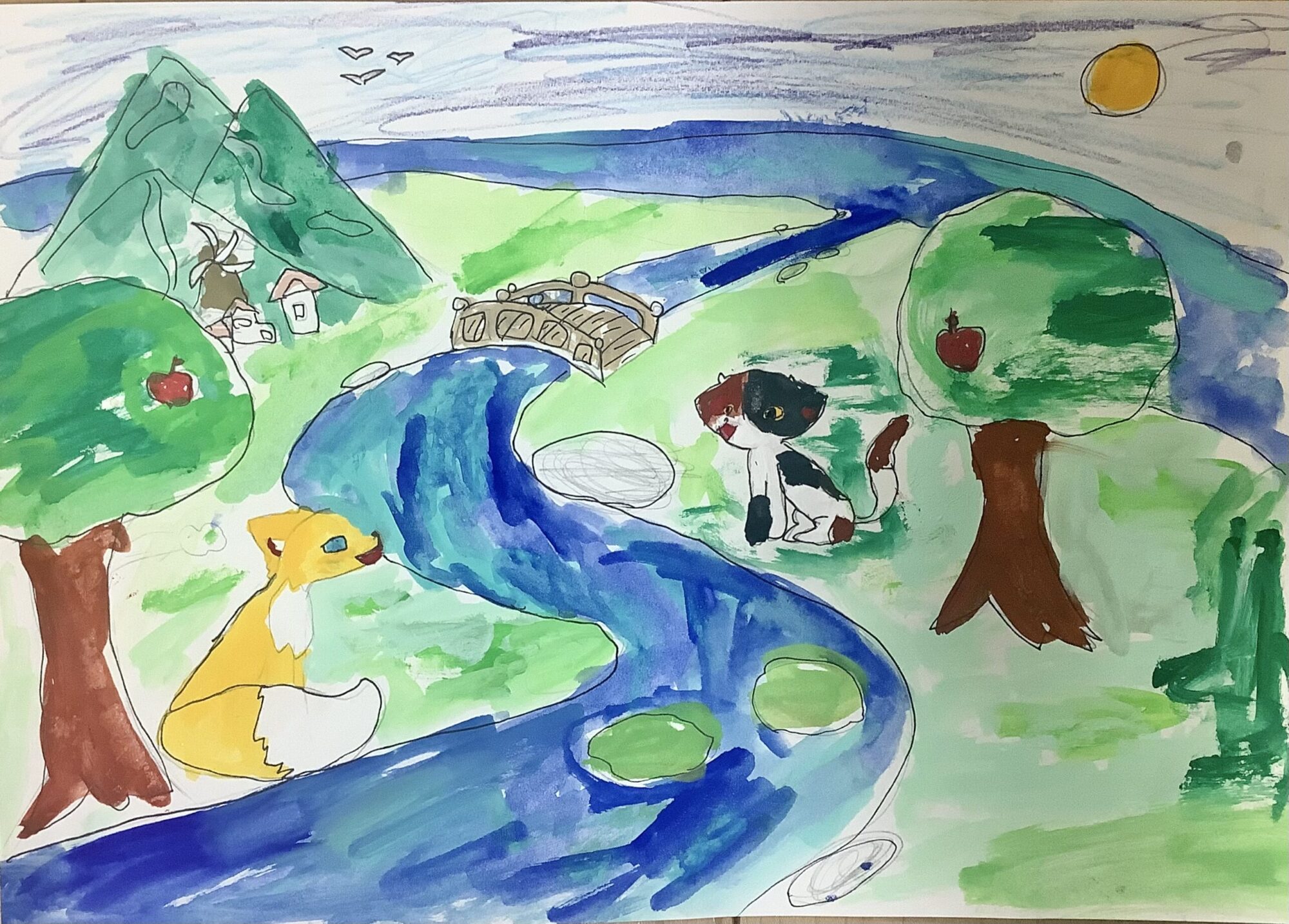 狐の尻尾がふさふさしているのが良いですね☺️猫さん狐さんが川を挟んでおしゃべりしてるように見えました!奥に村を描いているんですね。細かいところまで描き込まれていてすごいです