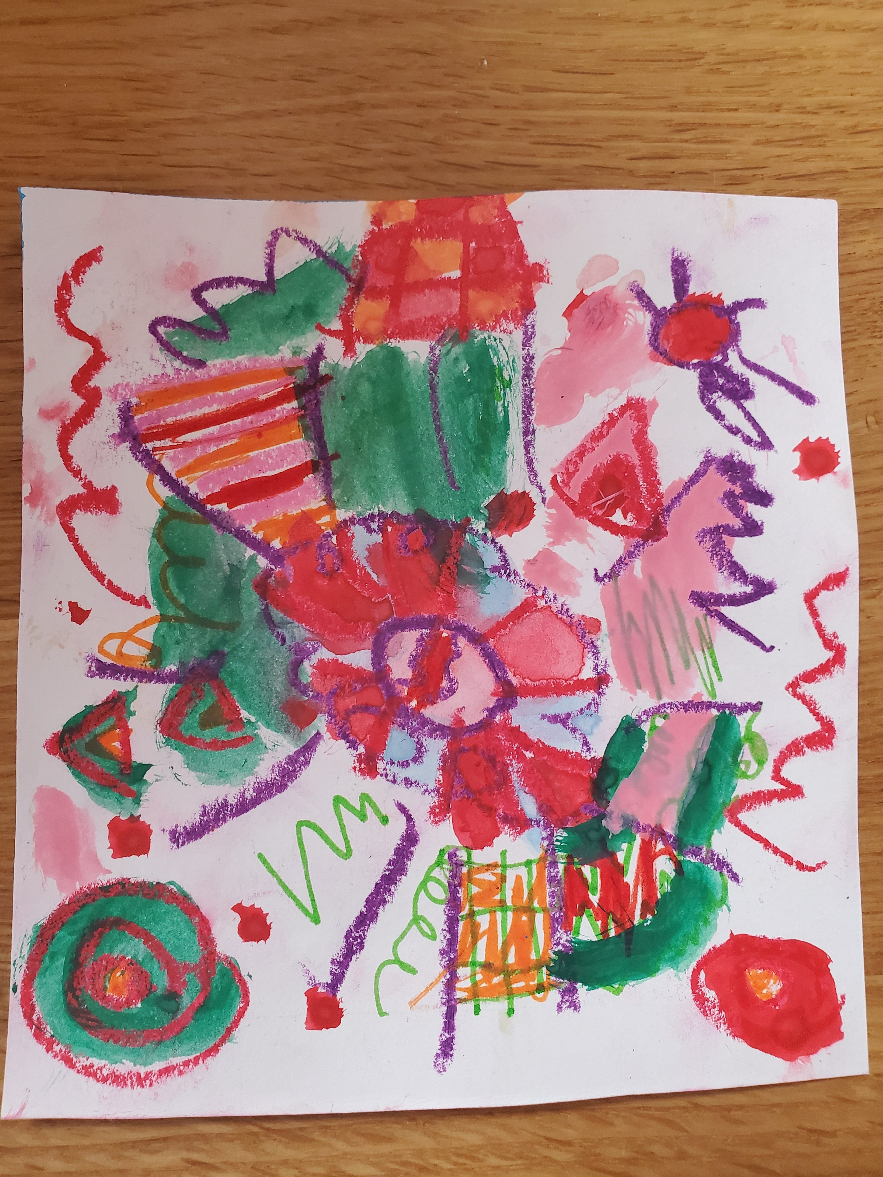 鉛筆がないと言っていたけど、クレヨンと絵の具、そしてカラーペンで、とってもおしゃれなのびのびアートをしてくれたね。