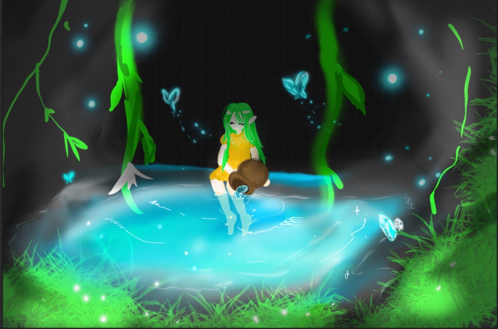 木の根元にある鉱石?みたいなの、自分で描いたのかな!?輝きが美しい!!