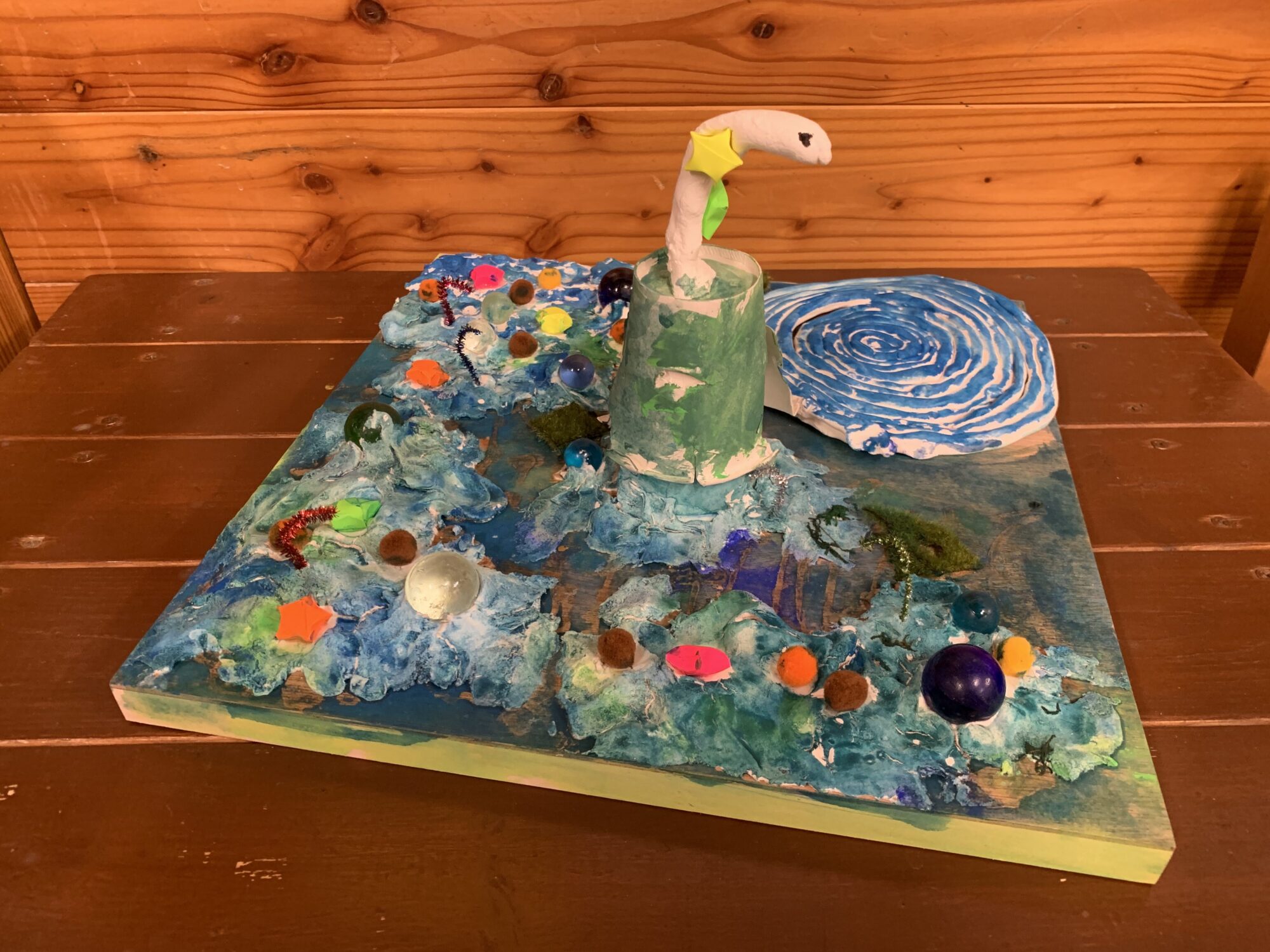見ていてとても楽しい作品ですね!チンアナゴに星🌟がくっついているのがおしゃれでいいですね!奥に渦巻きがあったり、ビー玉を使ったり、とても工夫がされていますね☺️