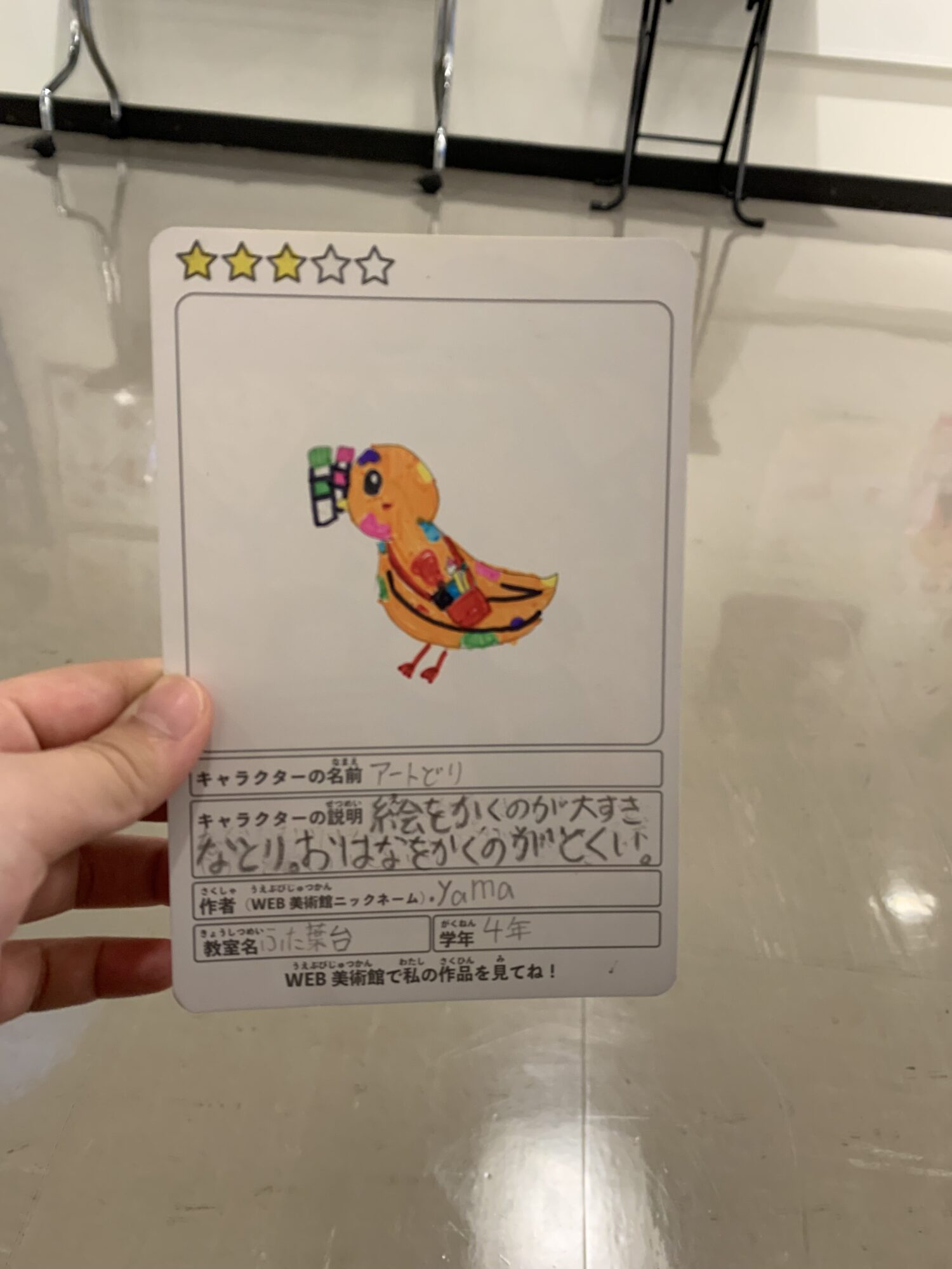 かわいい鳥さんですね!体にたくさんの色の絵の具がついてるところが、絵を描くのが好きなことが伝わってきていいですね🎨