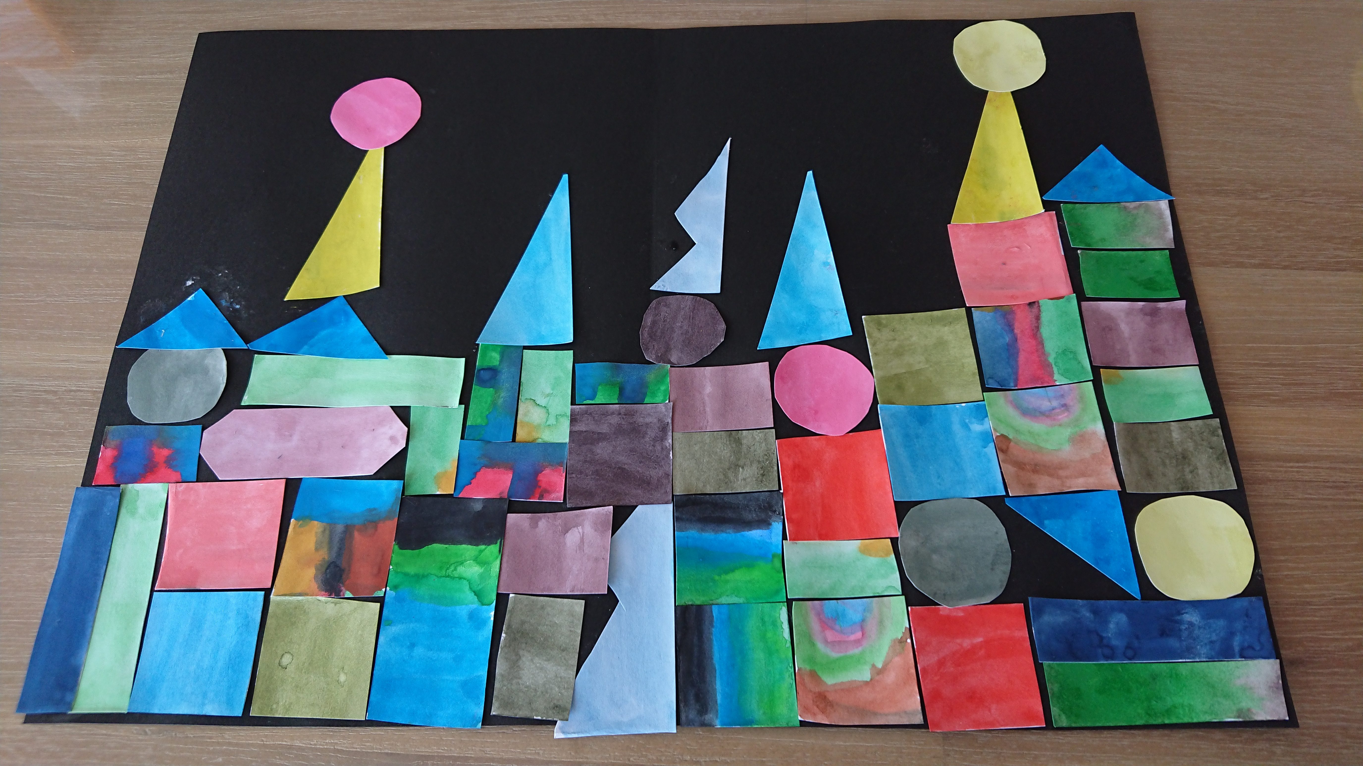 すごくノスタルジックな作品だなーと感じました。積み木の世界のような、黒い紙に貼っているから大人っぽい作品…色がハッキリでていいですね。