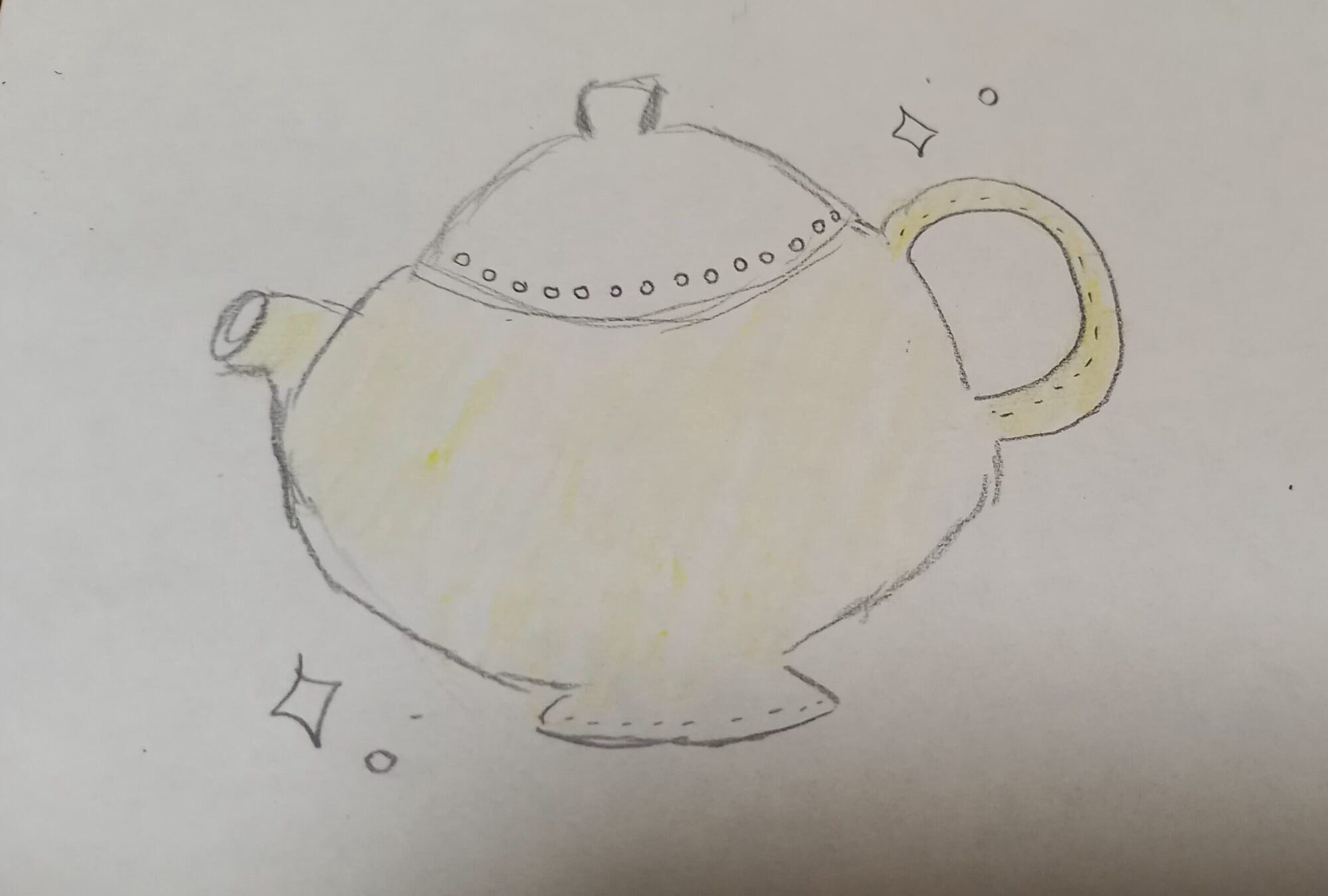 ポットの持ち手の部分は、光の当たり方で明るいところと暗いところが入り混じっていて、少しむずかしいかもしれません。でも、時間があるときにもう一度モチーフをじっくり観察してみると、新しい発見があると思います!