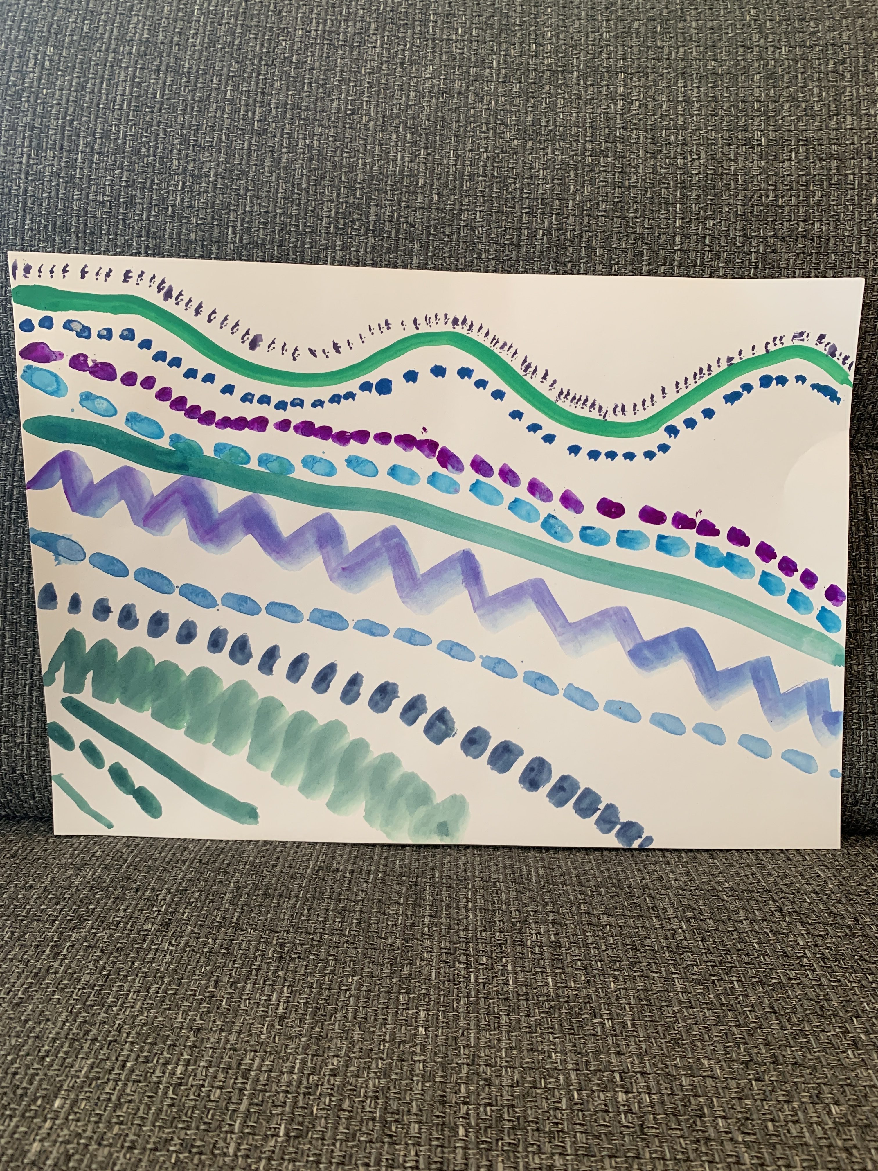 後藤ゆき先生 先生2020年4月30日 4:33 PM ruirui さん、とってもいいセンスだなぁ・・・! 線が豊富! 下の方のギザギザのラインは、筆のたっちがなんだか立体的に見えてこれまた面白いね~ 青系の色がきれいだけど、自分で混色して作ったのだよね? 青系の色の幅がとってもきれいです。 お部屋にかざってみてね。おしゃれなお部屋になっちゃうよ~! ログインして返信する ↓