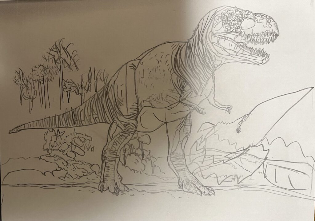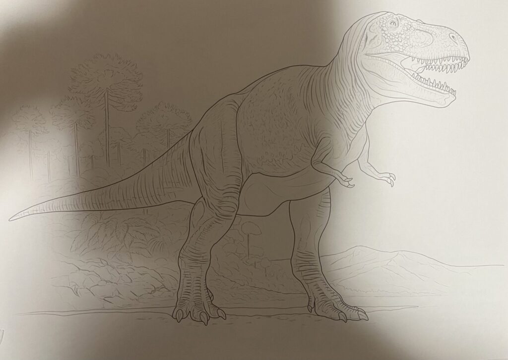 大人の塗り絵をなぞって、トリケラトプスを書き足して、色を塗ったよ🦖