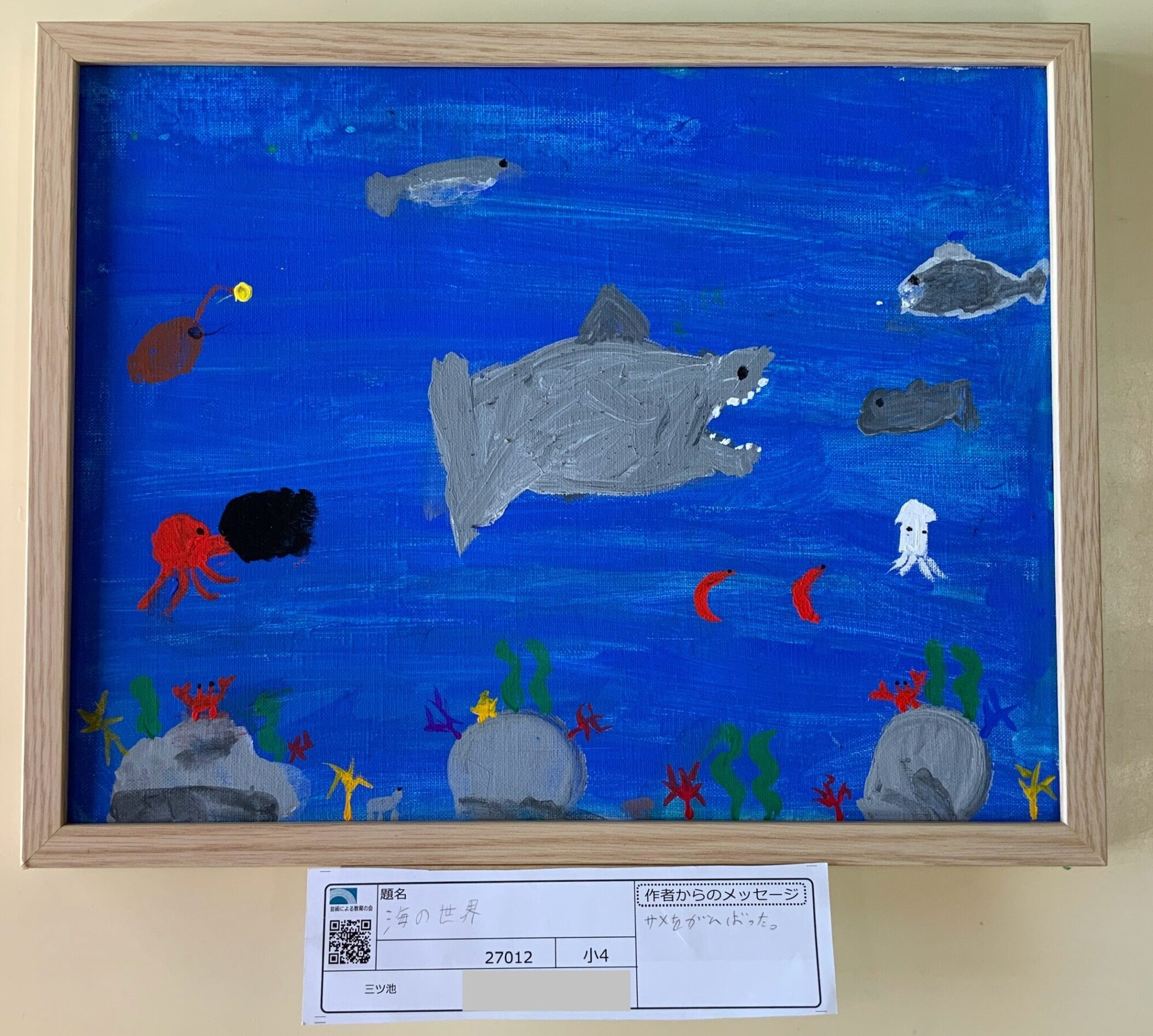 mochizuki naoko (三ツ池)2025年1月9日 6:37 PM かずくん、投稿ありがとう❣️ 海の中にたくさんの生き物がいて、楽しそうですね♪ 真ん中のサメさんが強そうでカッコイイ😆みんなを食べようとしてるのかな〜🥹 いろんな生き物たちが奥や手前に描いてあって、奥行きを感じますね。海の青色も濃淡があって、水の揺らぎに見えます! 毎年すごくなっていくかずくんに感動しました🤗 ログインして返信する ↓