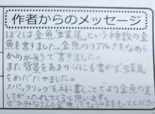 ひかり先生 チャイルドアートサポーター職業・専門:彫塑2025年1月11日 12:38 PM 金魚の尾がひらひらしていてとっても美しいね! 「蝶尾」という種類の金魚がいるんだね!初めて知ったよ スパッタリングにいろいろな色が混ざっていて水しぶきみたいでキレイ! ログインして返信する ↓