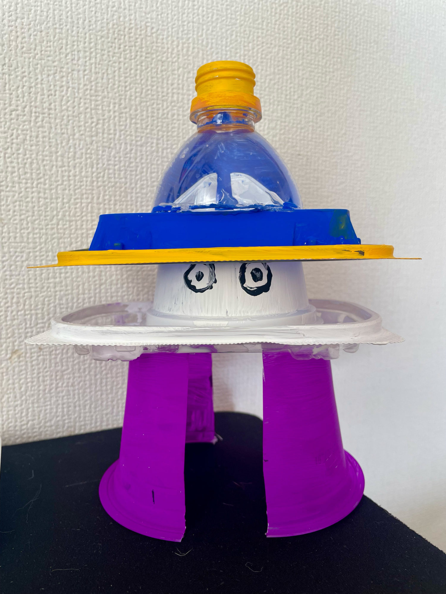 漬物の箱、ゼリーのパック、米のパック、ペットボトルを使って作った。 全部くっつけた後にペンキを塗ったんだけど、今思えば、先に色を塗ってから接着剤でくっつけたほうがよかった。