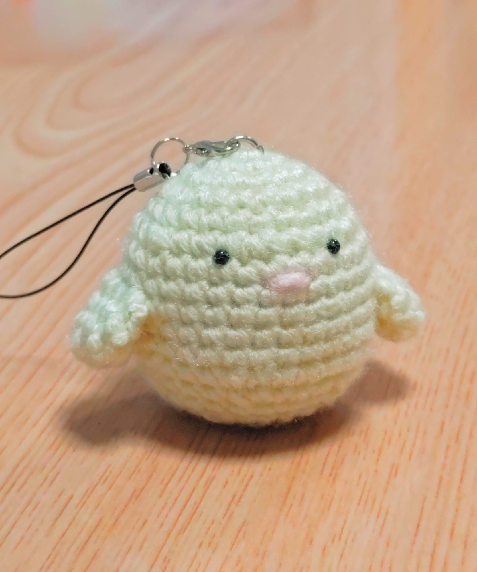 このこ、手編みなんですか?かぎ針かな。。つぶらな瞳がたまらないですね!小さな羽も