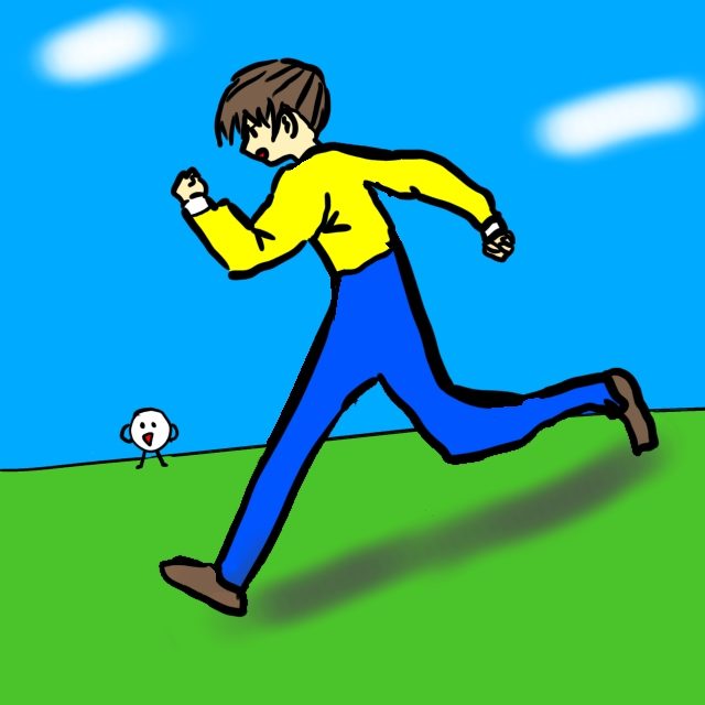 人が走っているところを頑張って見て描こうとしたことが伝わってきます!足や腕に躍動感があっていいですね🤩こめたろうは応援しているのかな?とても可愛いですね😍