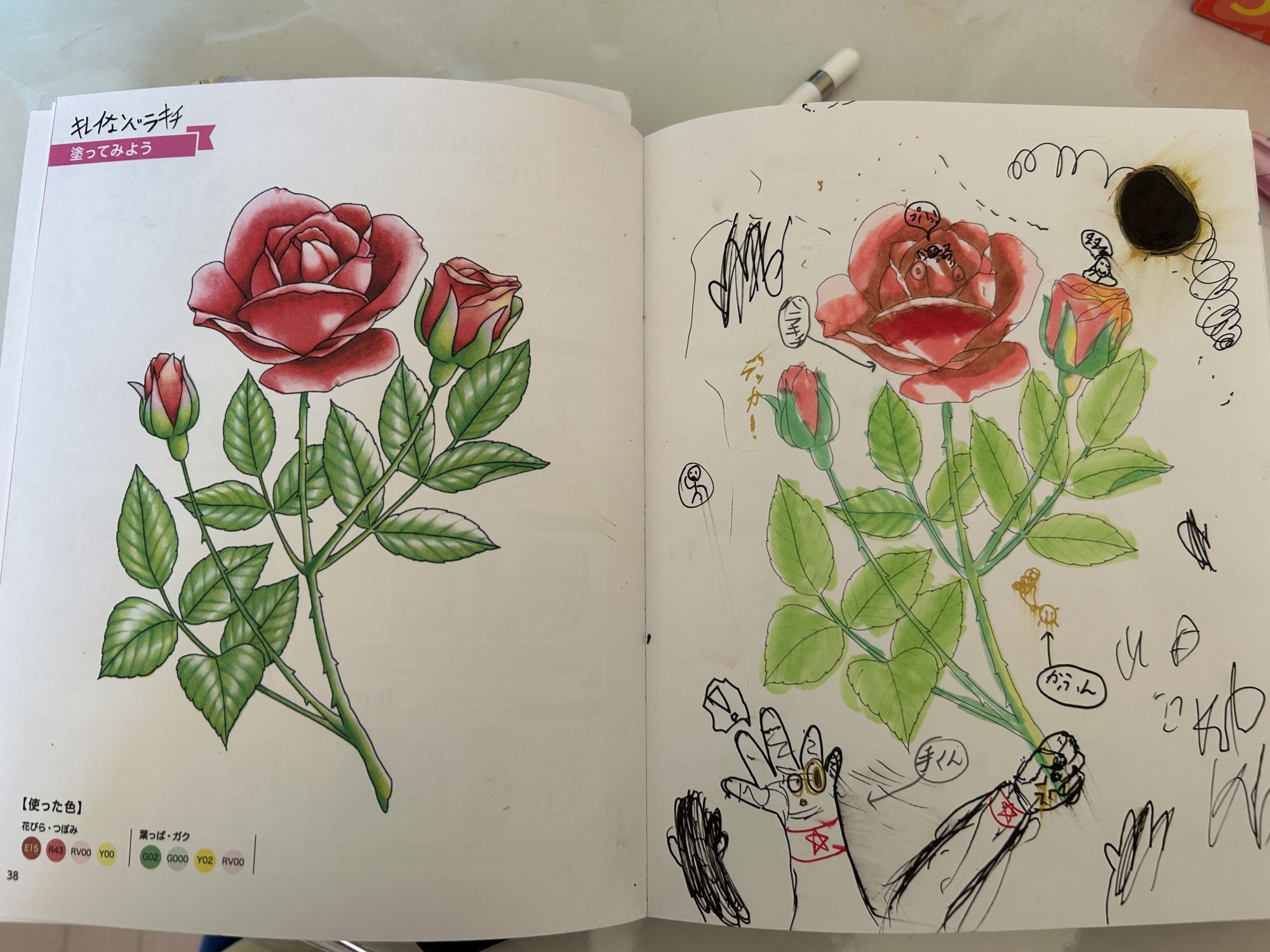 面白い作品ですね!バラを綺麗に塗るだけでなく、周りにもたくさんキャラクターを描いて、楽しい作品にしているところが素晴らしいです