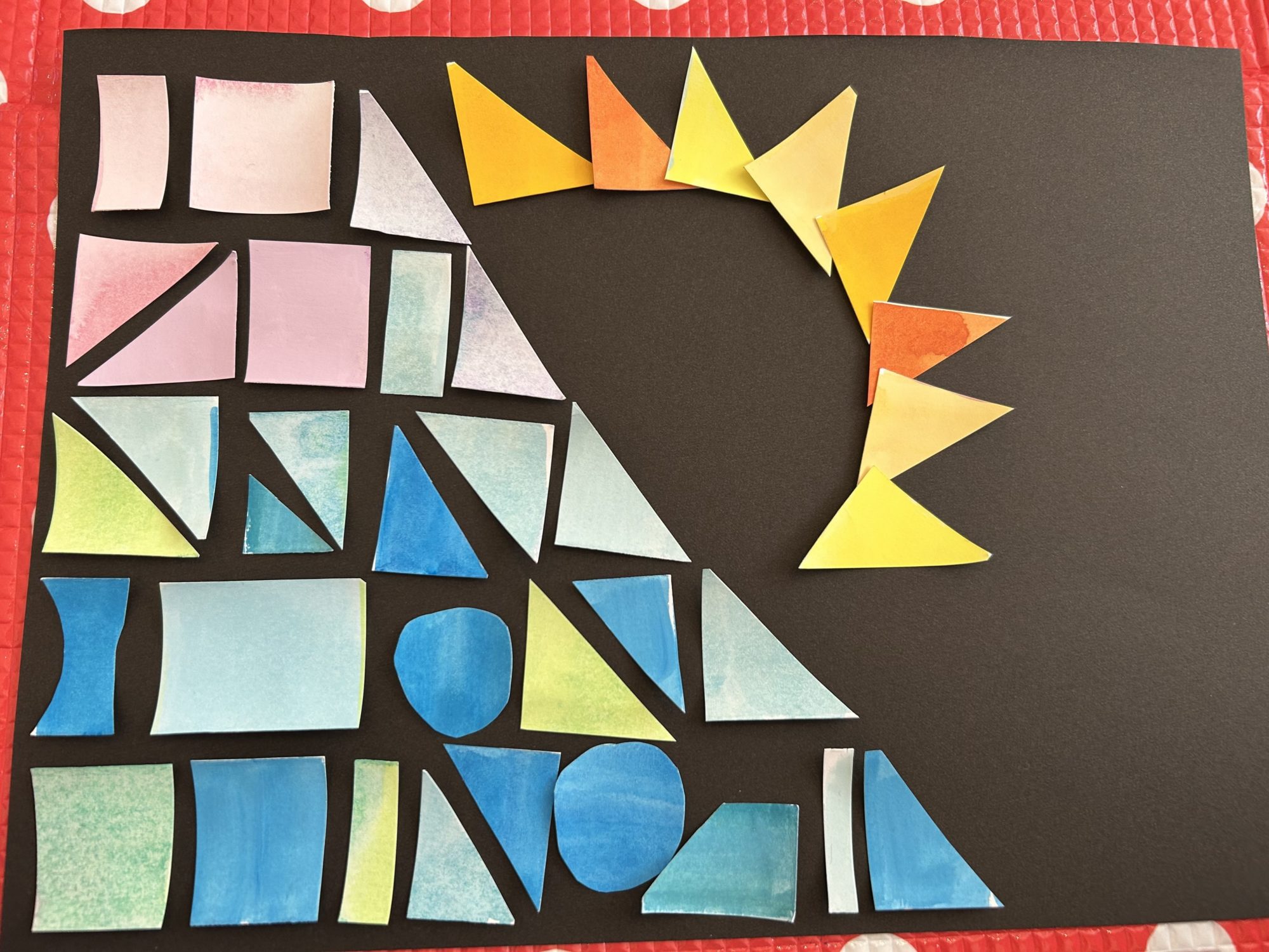 三角で囲って、のこした黒色を丸に見せて太陽の表現をしているところ、すごい・・・!!!!