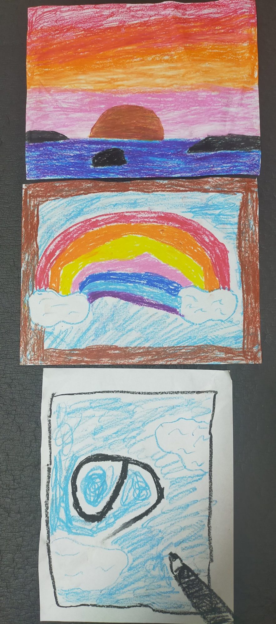 夕焼け空の色のグラデーションが綺麗ですね!写真を撮る時の黒い枠を書き込んでいるアイデアがすごいです