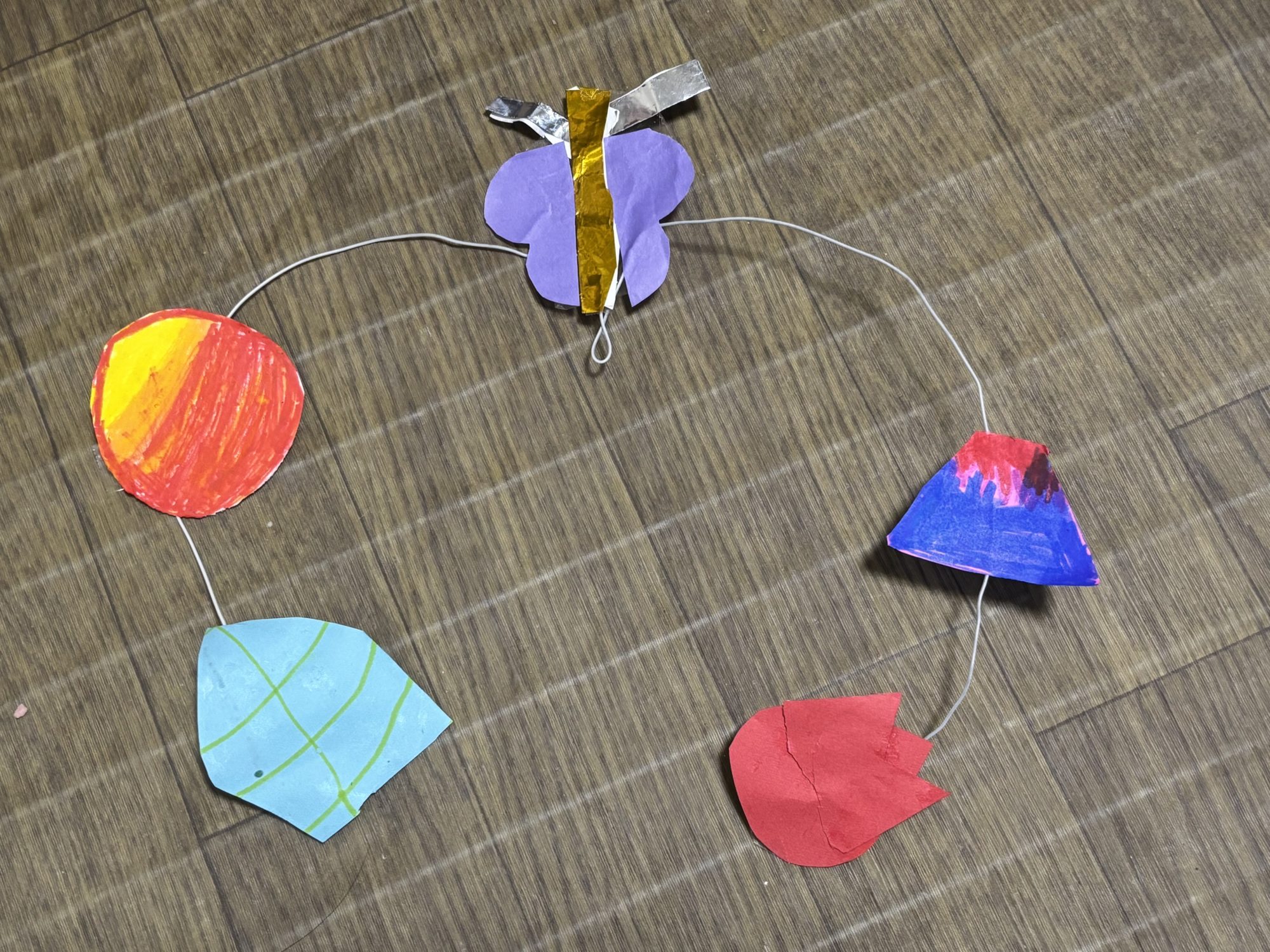 あみかの妹が一緒に作ったやじろべえです チューリップ、ちょうちょ、葉っぱ、富士山、夕日のモチーフが付いています