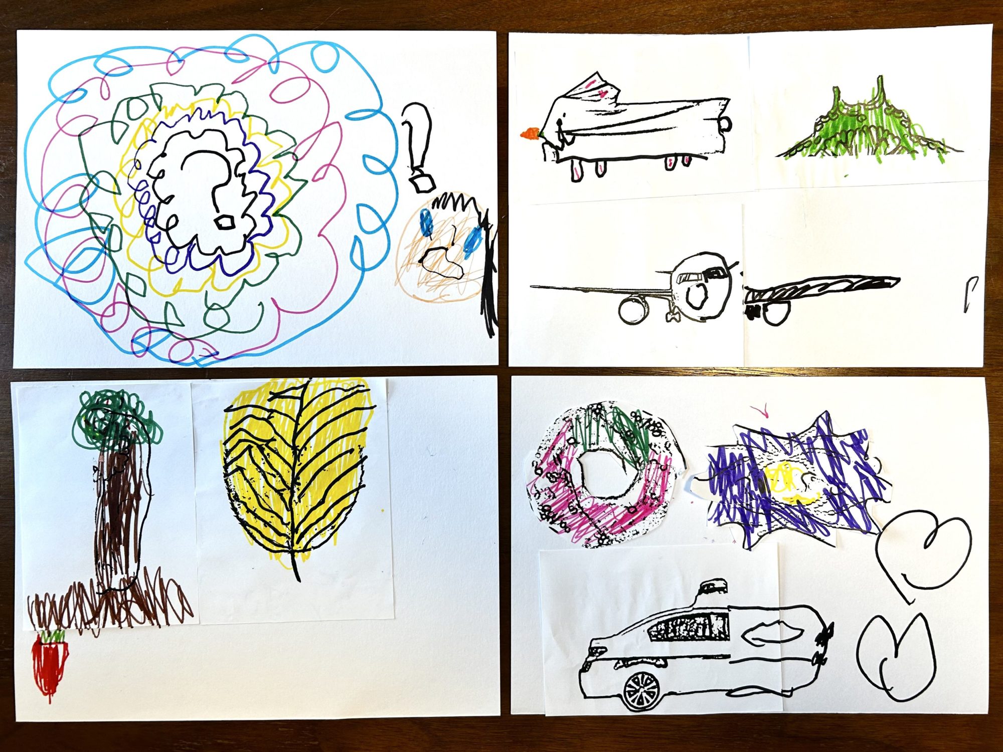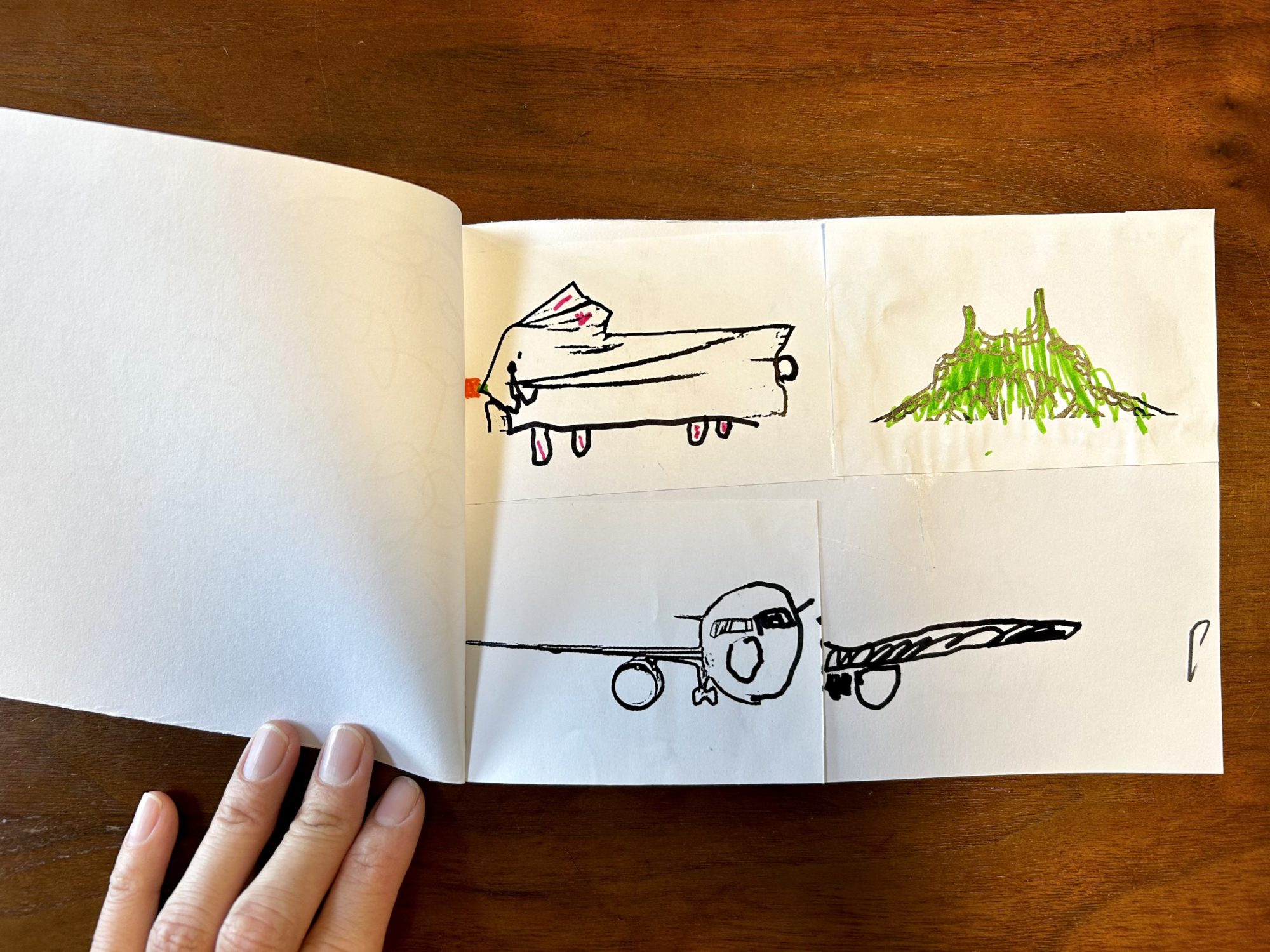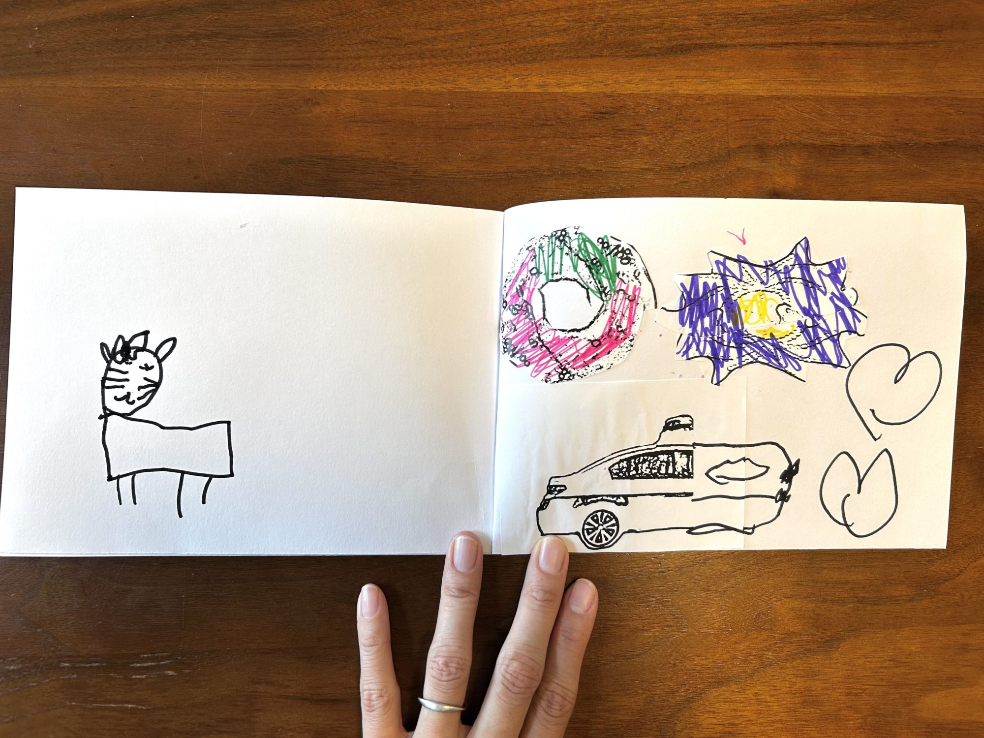 うさぎ、山、飛行機、木、大きな葉っぱ、抹茶いちごドーナツ、貝、車とたくさんの絵を作り、最後は絵本のようにしてキャラクターも描き足しました。