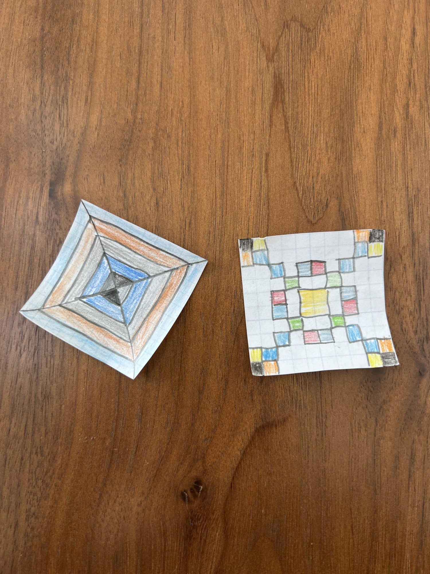 右の作品は、カラフルな四角がたくさんならんでいて、ゲームのマップみたいでわくわくするね!色のくみあわせがとってもきれいだよ✨