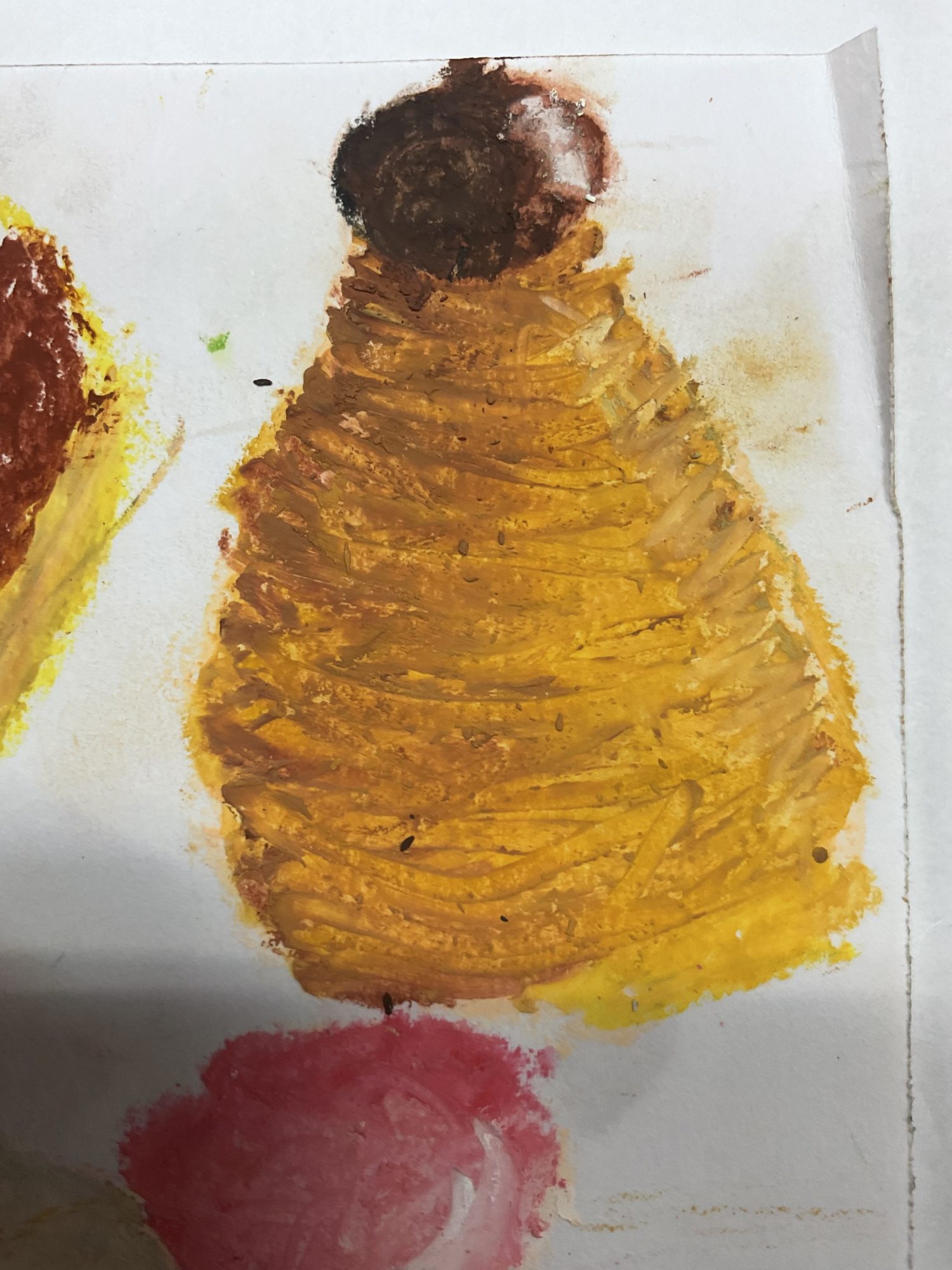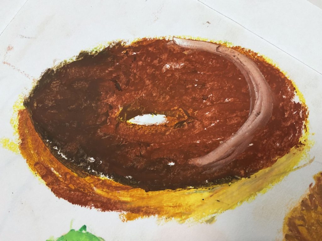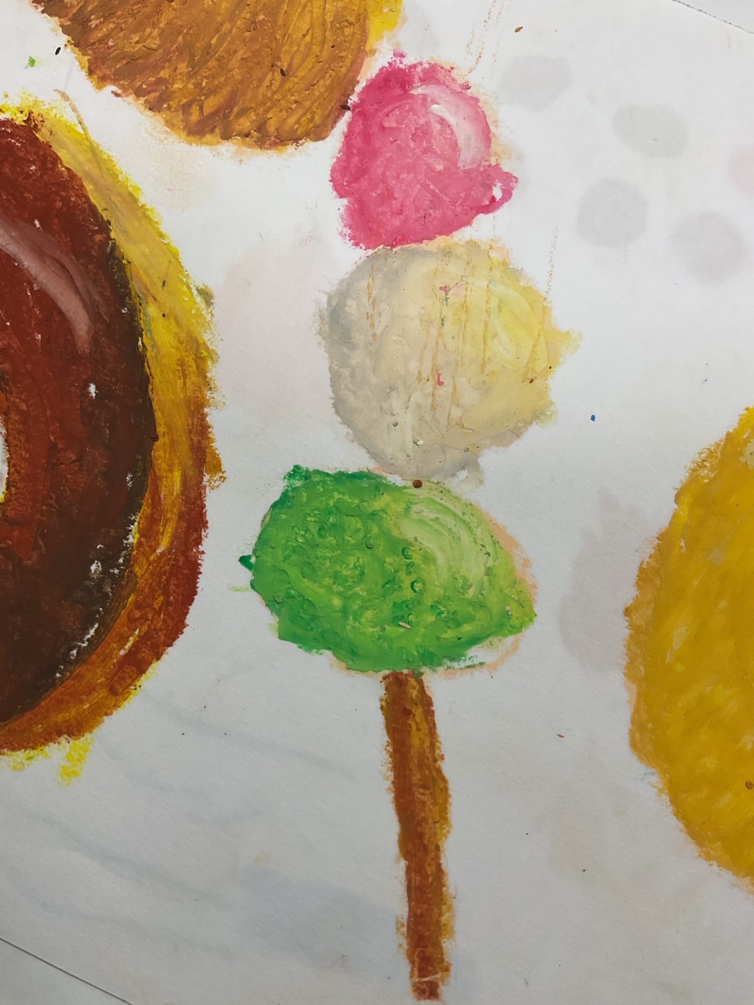 「クレパスで描きました」を見て、描いてみました。最後のチョコは、自分で考えて描きました。もっと描いてみたいです。