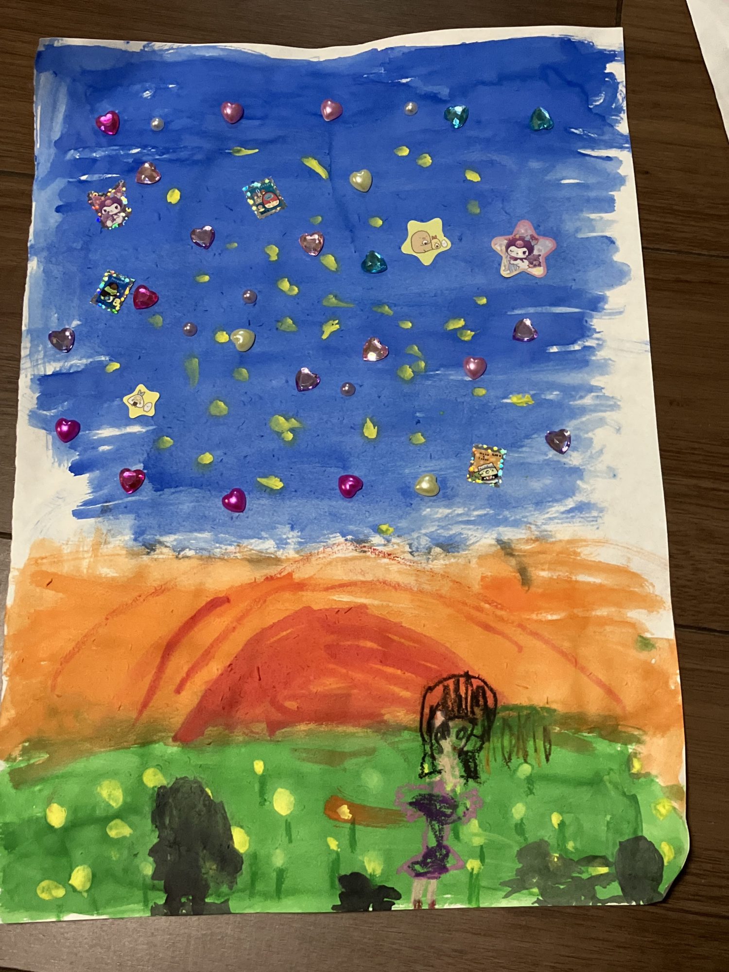 きくちわかこ 先生2025年3月28日 9:06 AM かえるちゃんのお気に入りのシールをはったのかな? にぎやかでかわいい〜✨ はなれて見たら、なのはながりったいてきに見えることに気がついたんだね! すごくいい発見をしたね!🤩 よぞらとゆうやけがまざっていく感じが、ちょっとせつなくてステキ✨ ログインして返信する ↓