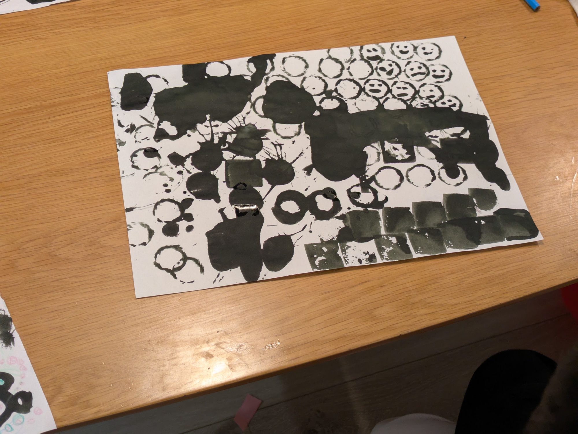 色々な方法で制作したことが伝わってきます!顔のところが特にかわいいですね😍丸や四角や、水滴を落としたような形もあって賑やかですね