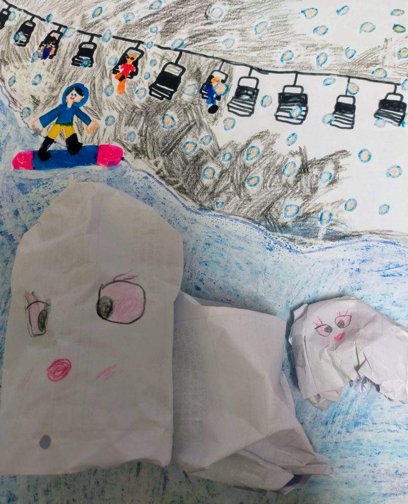雪のなかの細かいところまで色塗りができていたり、雪のしっとりとした質感を再現するために、クレヨンや絵の具を使っていたり、飛び出でくる仕掛けがあったり、この一枚の作品にとてもたくさんの工夫が詰まっていますね!
