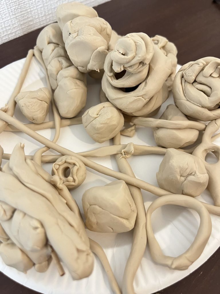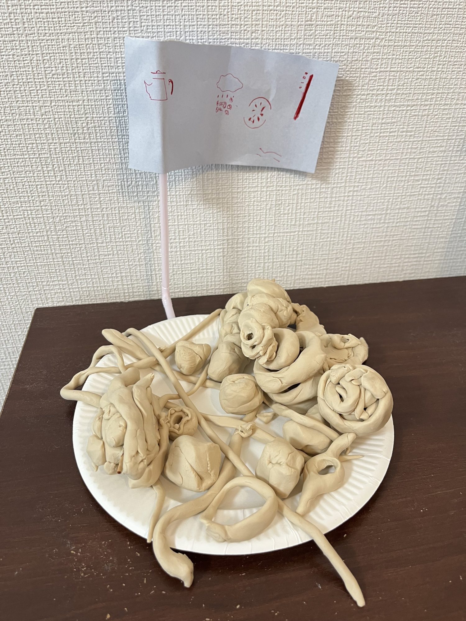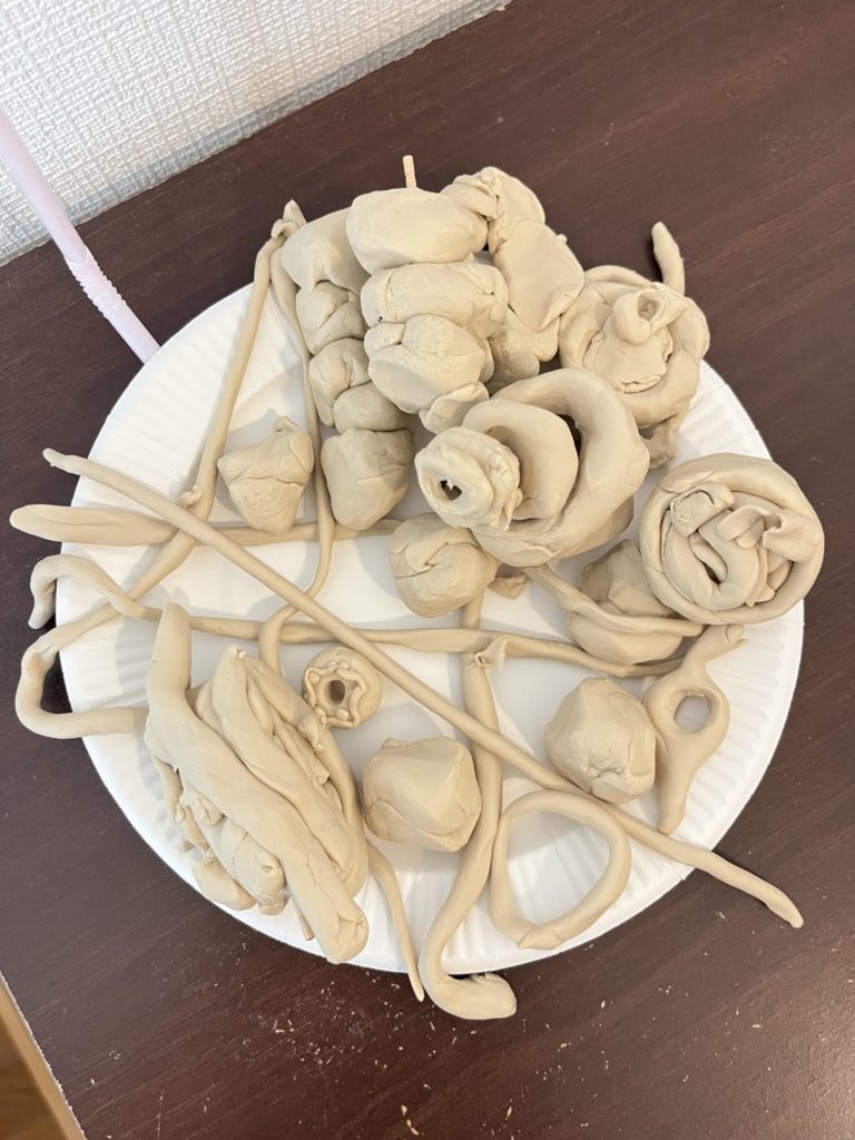 ほそーくながーく作ることが初めてできたので、集中してたくさんつくりました。(紙皿の下の方に敷いてあります)