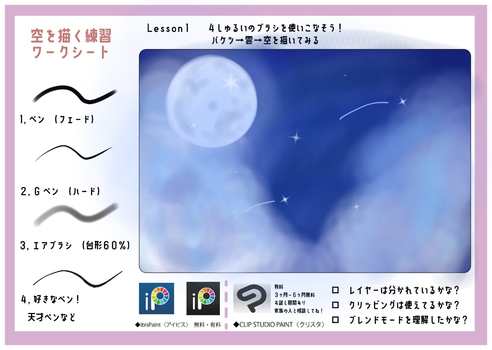 きれいな夜空ですね!淡いブラシを使って雲を表現していて、すごいです