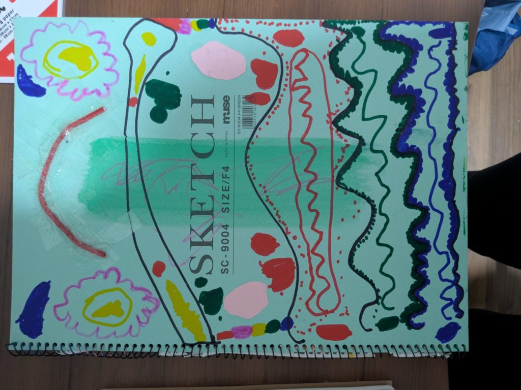 薄い水色をいかしてこちらはカラーペンの色をたくさん使って楽しんだんだね。