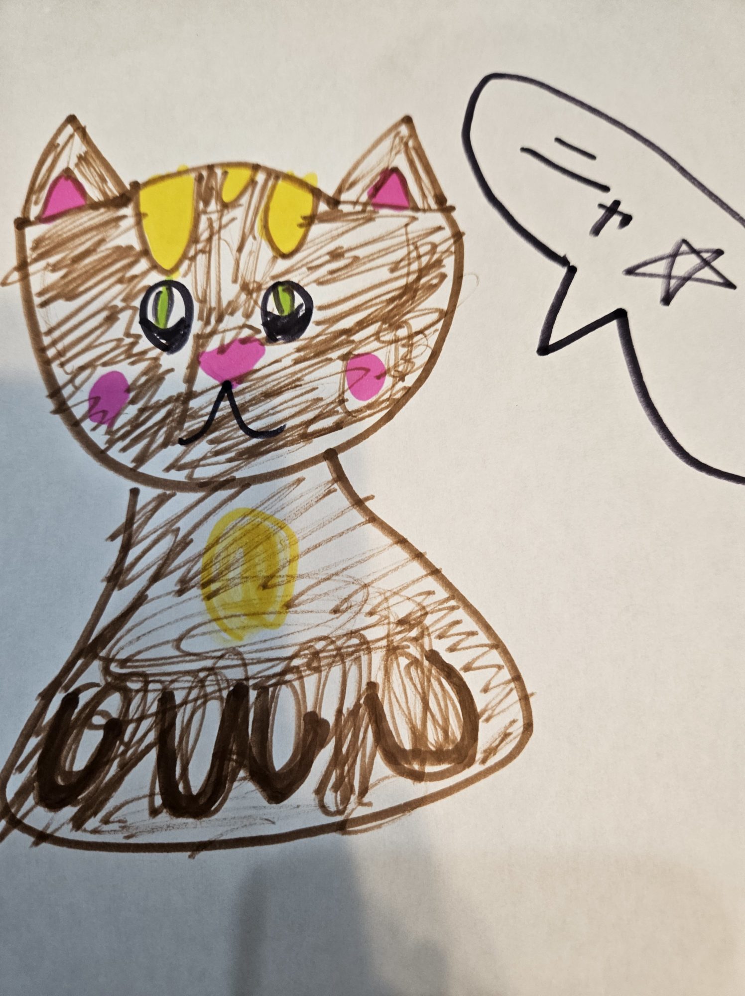 この猫ちゃんは、目が緑色です。おでことお腹の色は、黄色です。