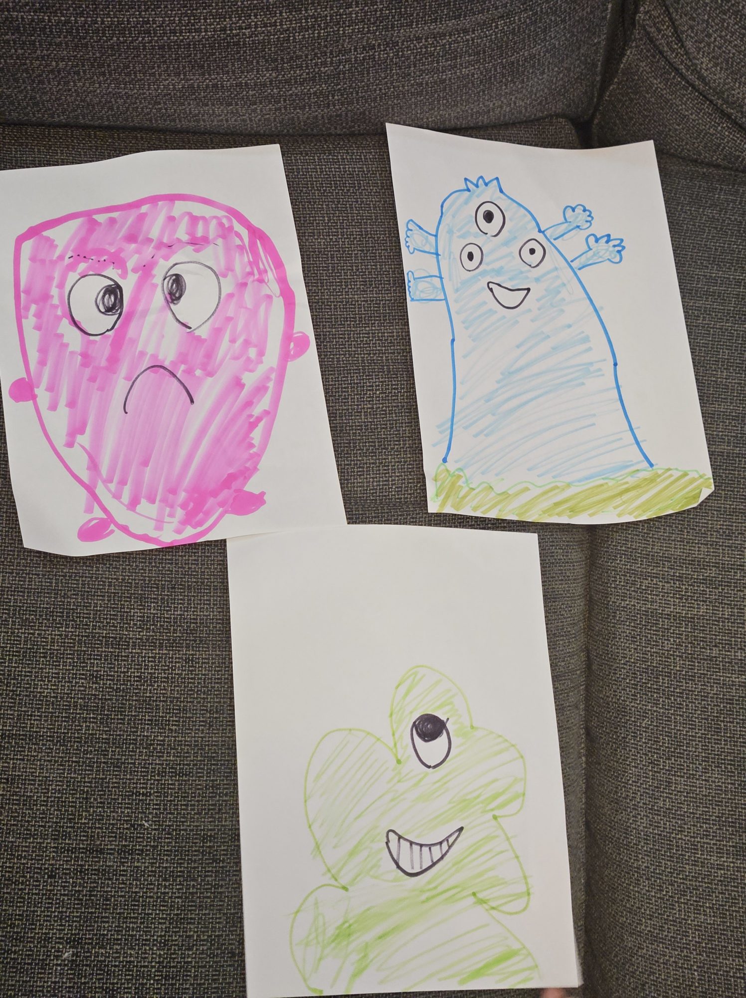 青いモンスターは、目が3つあって手は、4つあります。緑のモンスターは、ベトベトしていて、目が1つしかありません。ピンクのモンスターは、いつだってより目になっています。