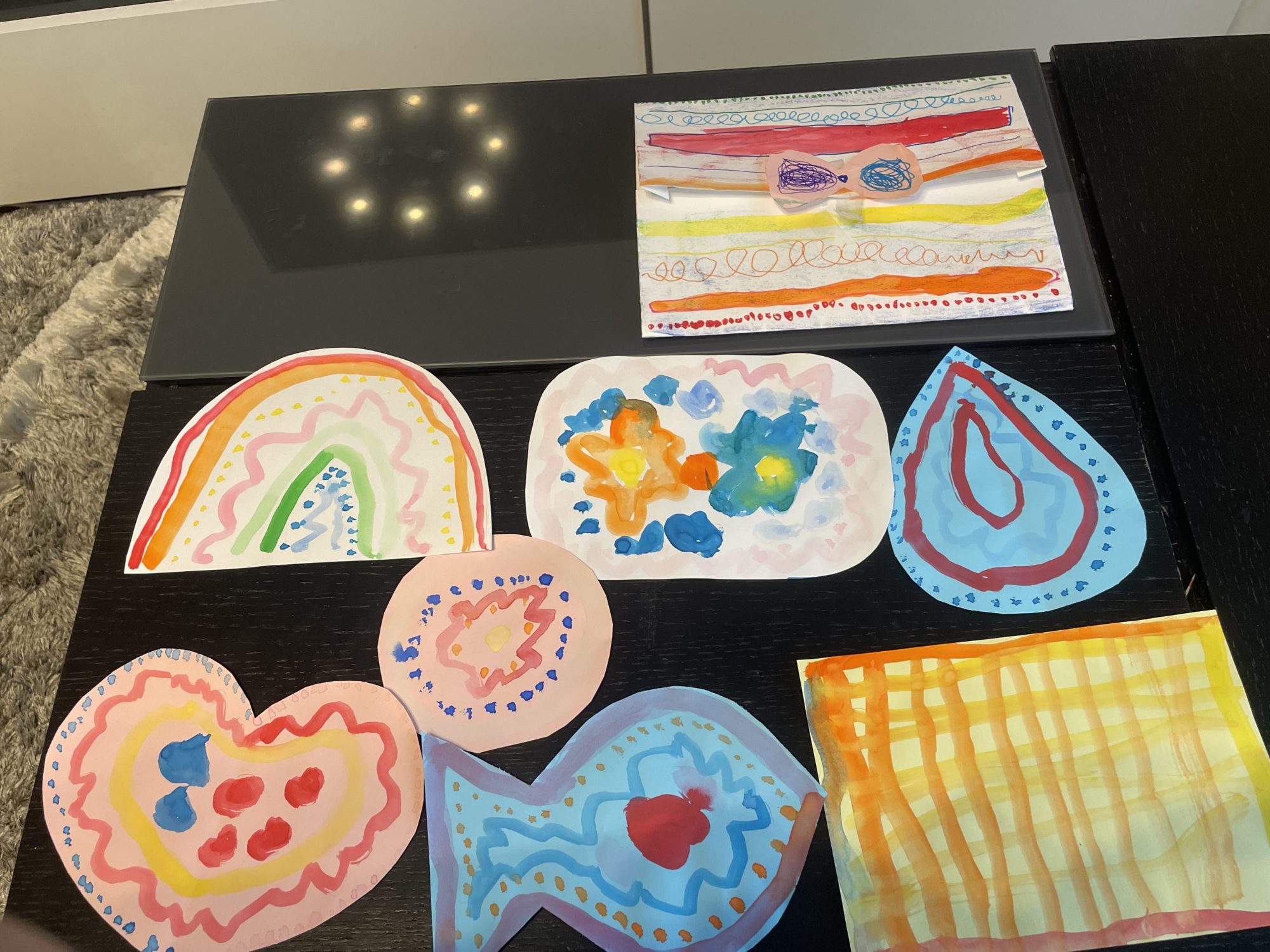 カラーペンの細い線や、絵の具のさらっとした伸びやかな太い線、そしてコロコロとしたクレヨン特有の表情などいろんな画材で作品を作っているのもとっても楽しそうです!
