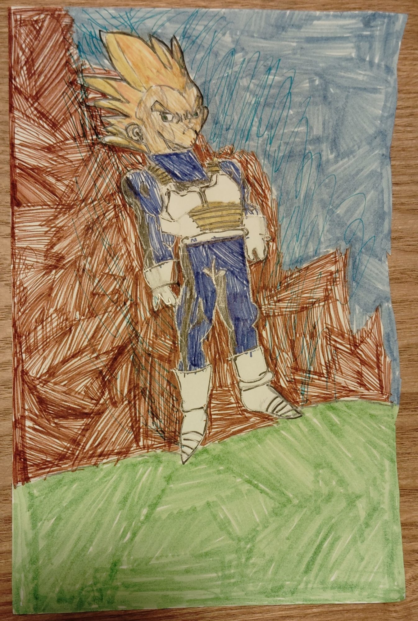 髪の毛のとがった形や、戦闘服のディテールまでしっかり描きこまれていて、hanaさんの「一番好き!」っていう気持ちがすごく伝わってきました。背景も力強い線で埋められていて、ベジータの気合とスピード感がぐんとアップしてますね。