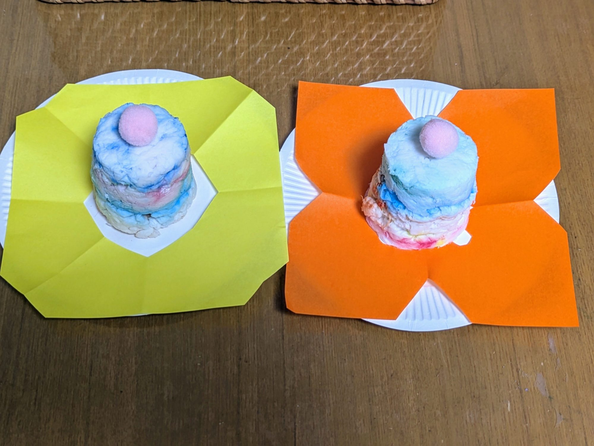 特に、色のにじませ方がとってもやわらかくて、まるでお花のクリームみたい!紙皿の台紙の色との組み合わせもバランスがよくて、パッと目を引きます🌼🧡