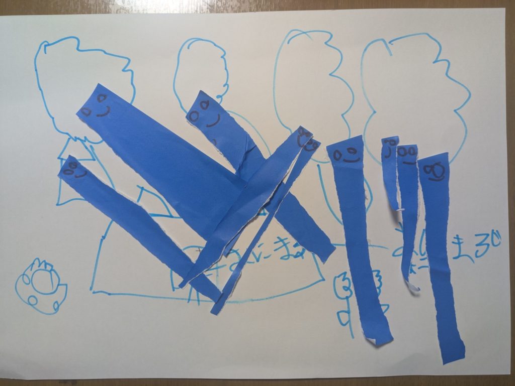 おえかきとちぎり紙、どちらもじょうずに使っていて、とっても楽しい世界になってるね😊