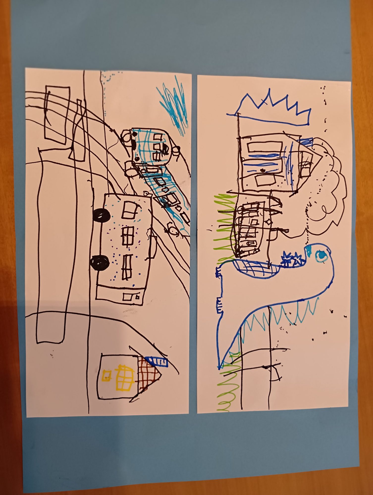 怪獣の背中や電車の窓など、細かいところまでよく考えて描かれていて、「じゆうそうが」の楽しさが伝わってきました。