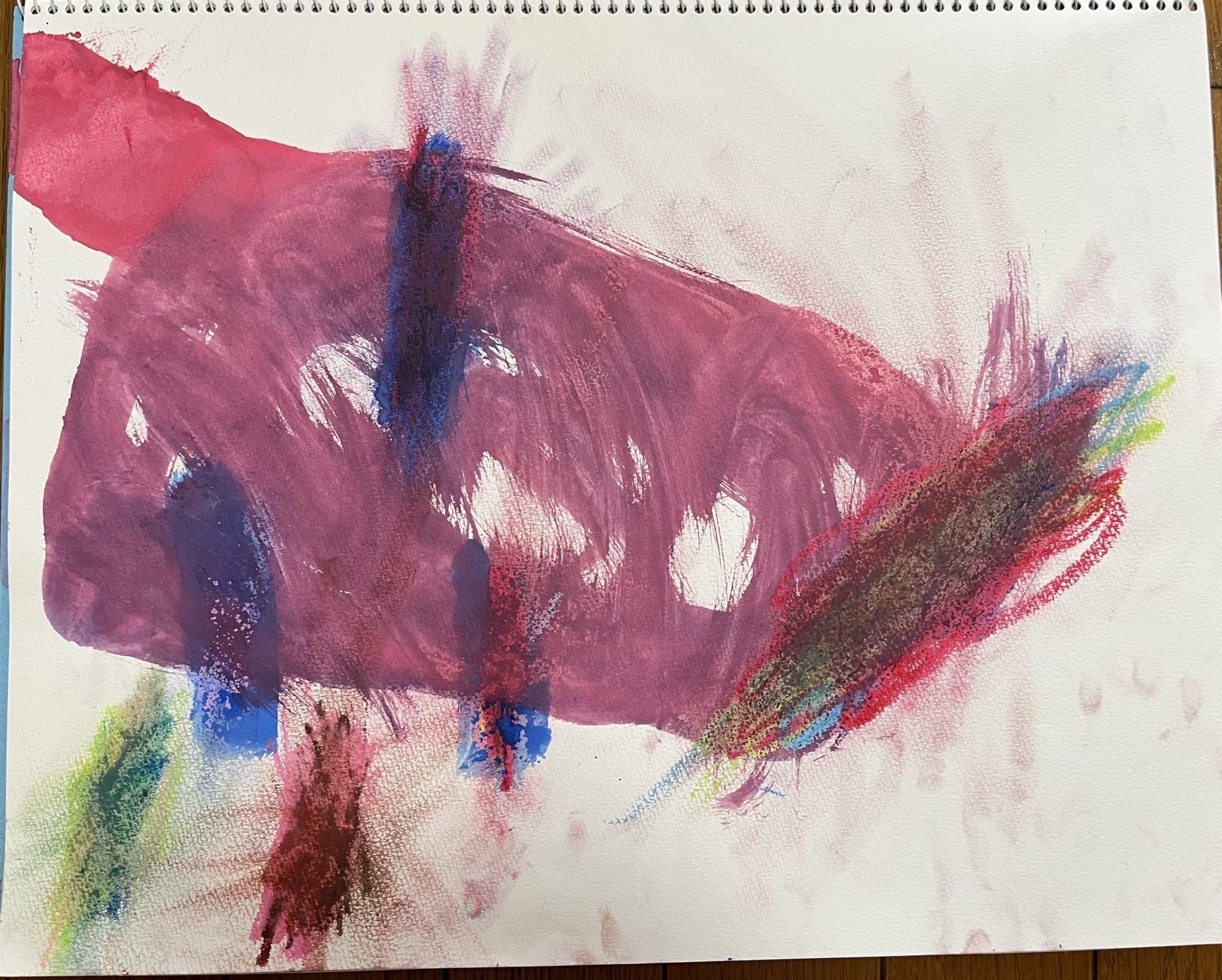 クレヨンを手に何本も持って、一気に描きました。そこを指でゴシゴシ広げるところがおもしろかったり、なかなか色が混ざらなかったりして、頑張ったそうです。