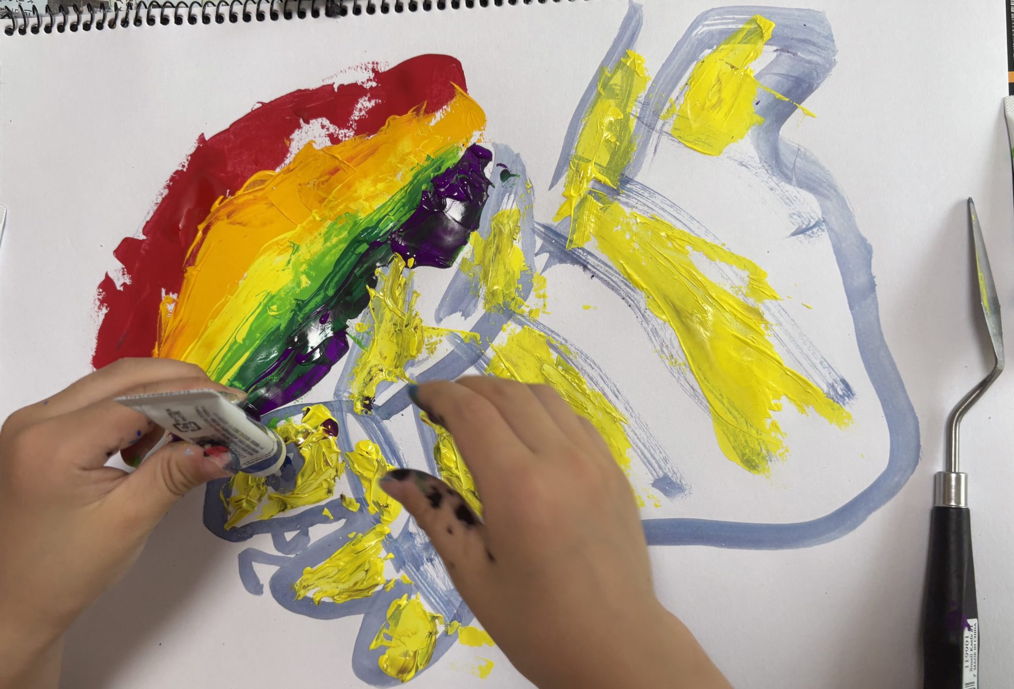 この「虹色恐竜」は、色のエネルギーがあふれていて、絵の具の楽しさが画面から伝わってきます。大胆な色使いや、手でぬったり、ナイフで塗ったりと、いろんな道具や方法を試しているところも、とてもすてきですね。
