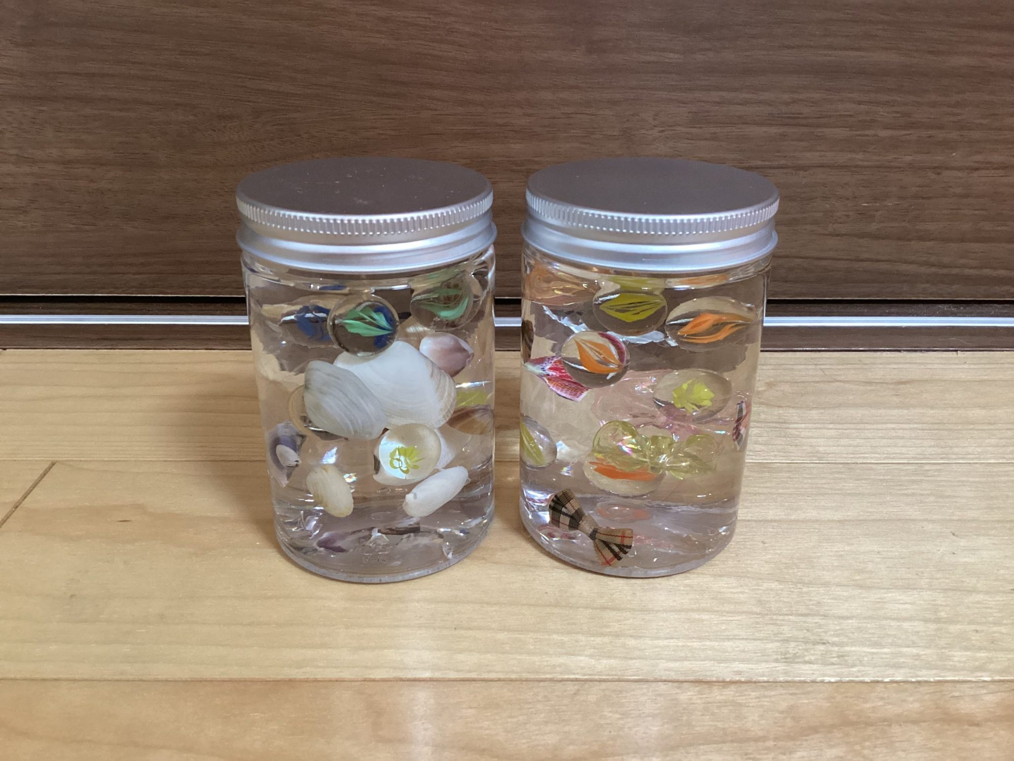 ビーズやビー玉のきらめきが光を受けてキラキラして、ずっと眺めていたくなりますね。