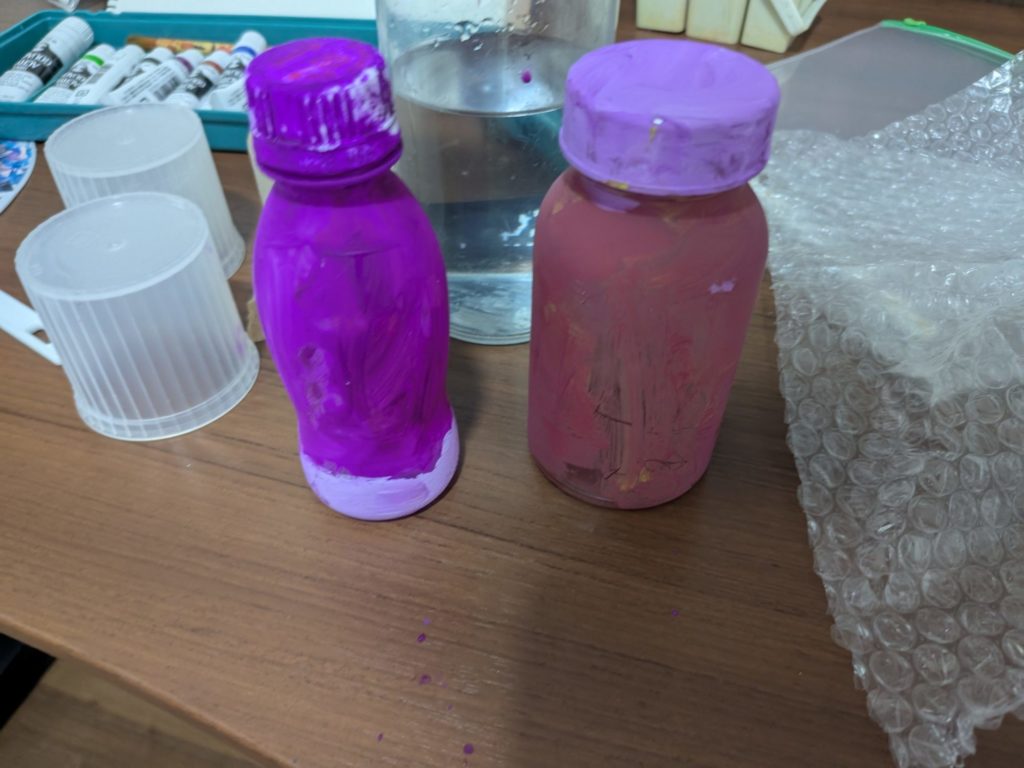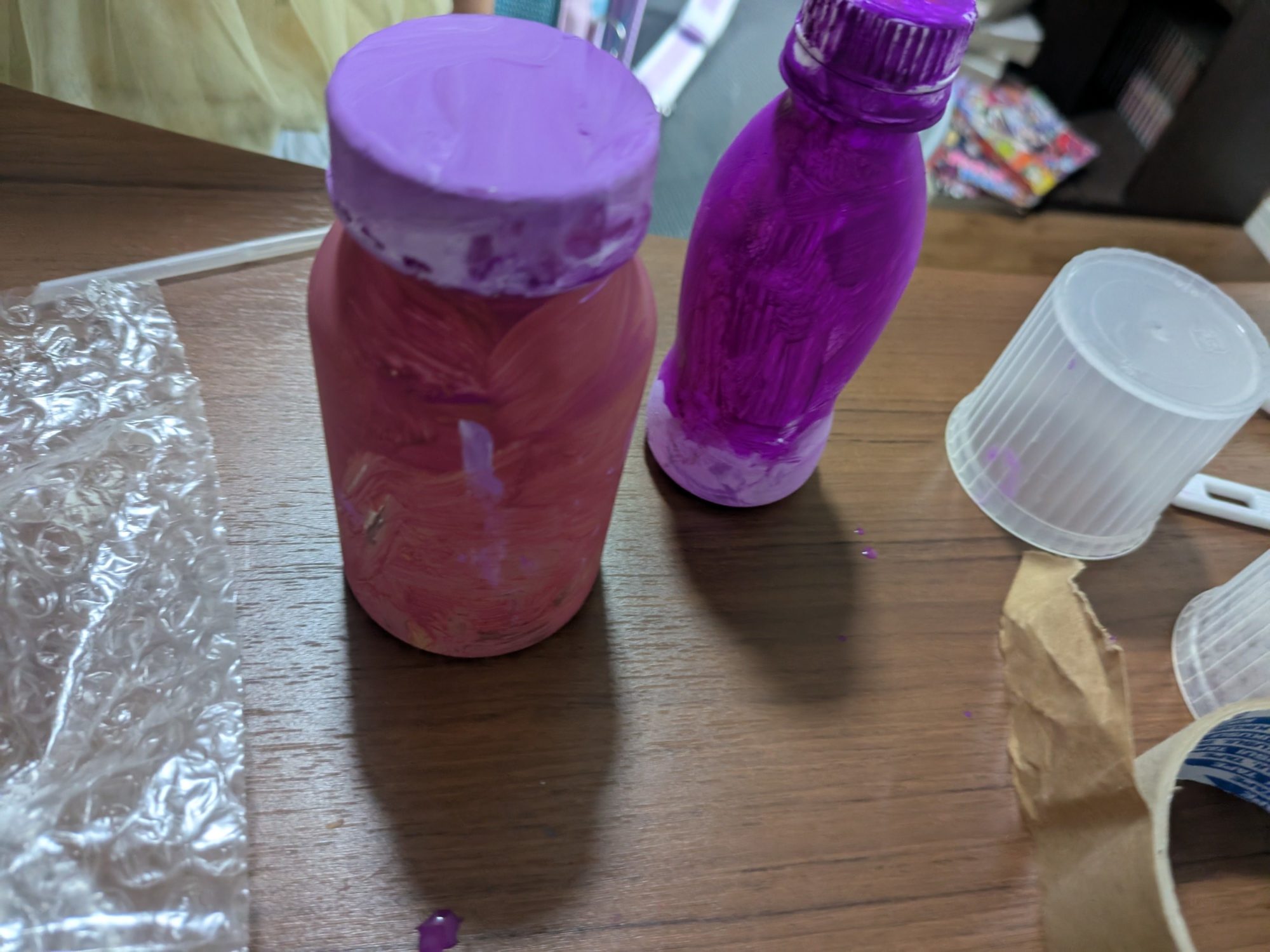 ボトルも入れ物も、カラフルに塗ることで、ただの道具ではなく“かざりもの”に生まれ変わりました。