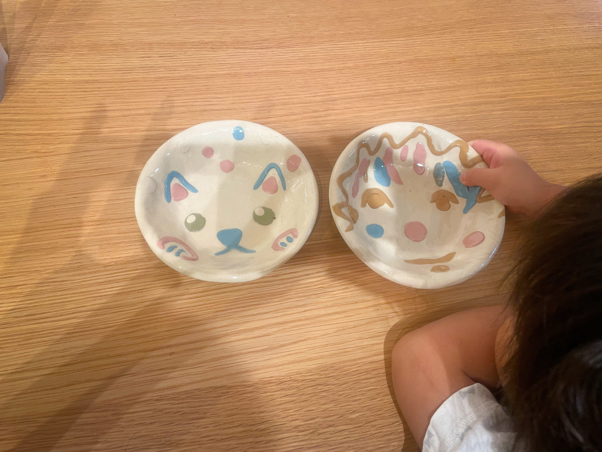 さわちゃんが作ったお皿、どちらもとってもかわいくて、思わず笑顔になりました!ネコちゃんの表情も、自分の顔も、やさしい色と形でしっかりと表現されていて、3歳とは思えない仕上がりです✨
