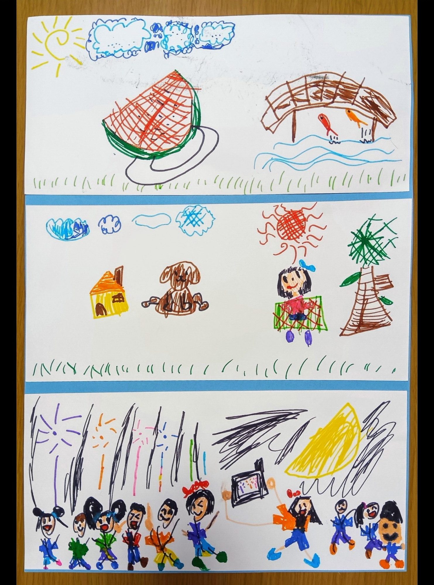わかめせんせい 先生2025年7月15日 8:53 AM 🌞sawaさん🌞 夏のワクワクがぎゅっとつまった一枚ですね! 上の段のスイカはとってもおいしそう🍉✨ お魚が泳ぐ橋のある風景は、まるで夏の旅行先みたいです🐟 真ん中の女の子と犬のシーンは、ちょっとしたドラマがはじまりそう…!🏃♀️💨 どんなやりとりがあったのか、想像がふくらみますね😊 そして下の段の花火大会🎆 色とりどりの花火に、おどるような人々の姿から、楽しさがはじけています! ひとりひとりの表情までていねいに描いてあって、見ている私も楽しくなりました🎇🎶 この絵のなかで、いちばん思い出にしたいのはどのシーンですか?🌙📸✨ ログインして返信する ↓