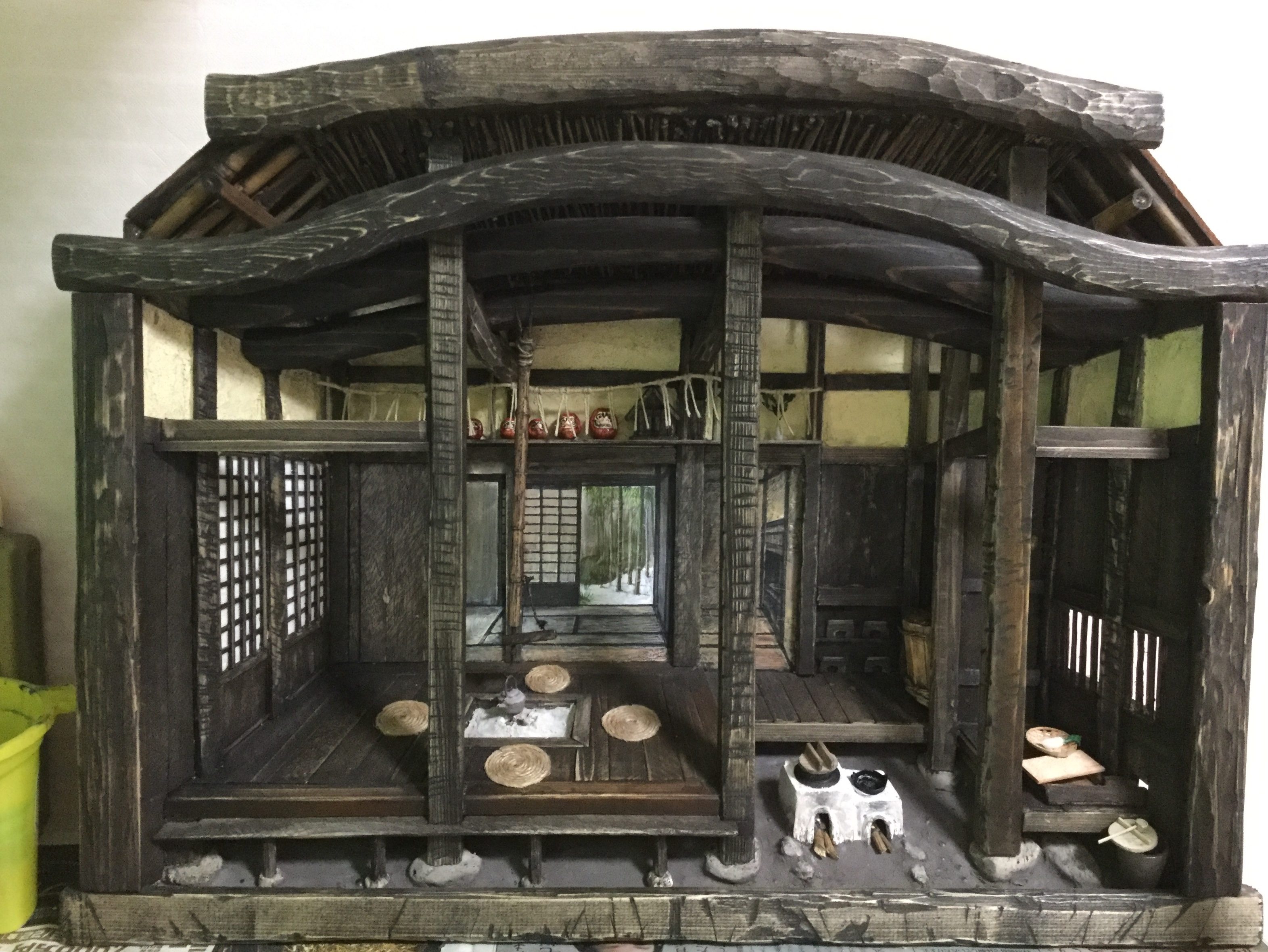 古民家をモチーフにした壁掛け作品、奥行き20センチに奥行きがあるかのように、だまし絵的に制作