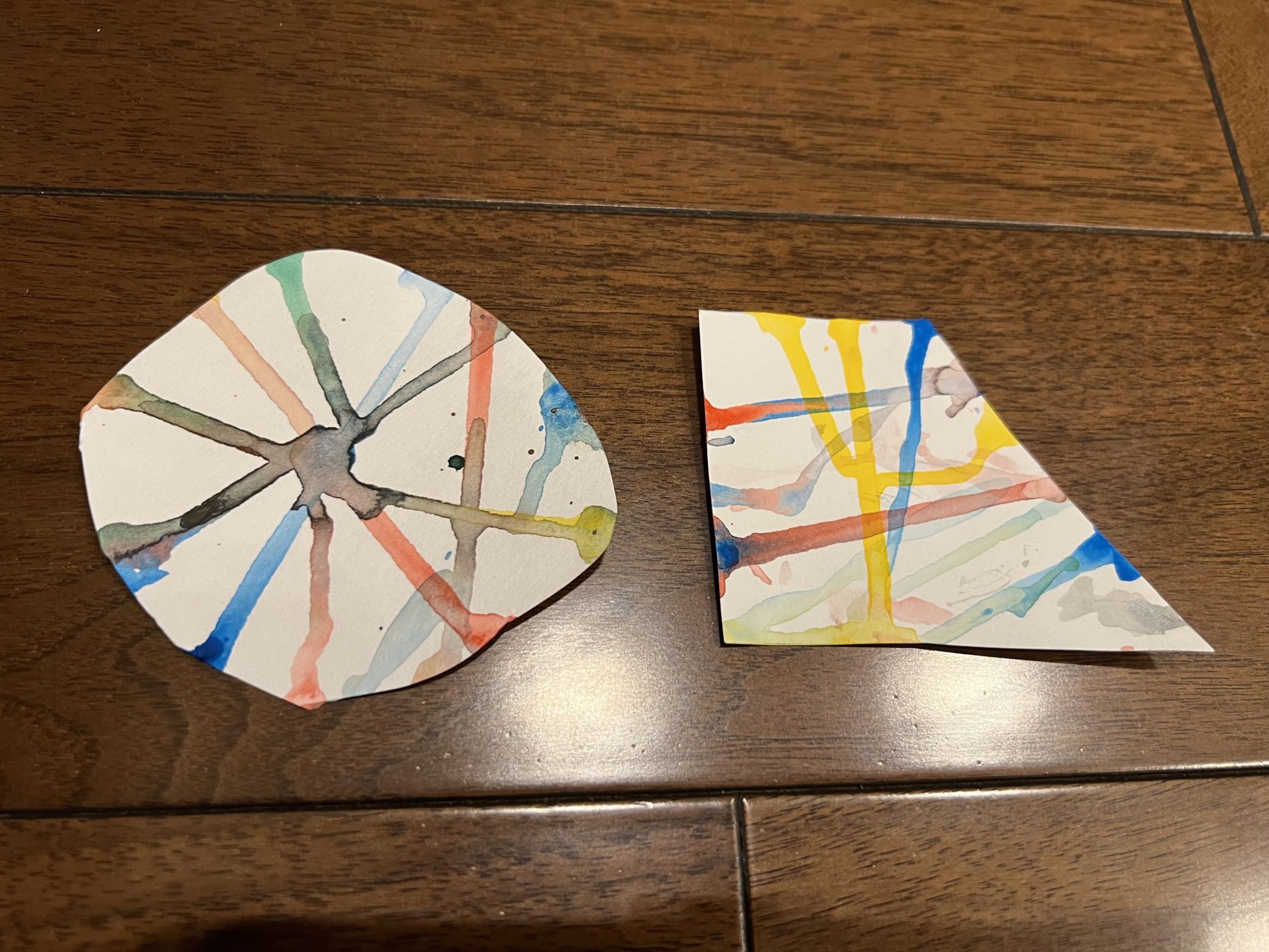 とてもおもしろい模様ですね!🌈 にじんだ絵の具が線のように広がっていて、まるで色の花火のようにも見えます。絵の具が苦手だったのに、こんなに自由に楽しめたことがとてもすてきです😊