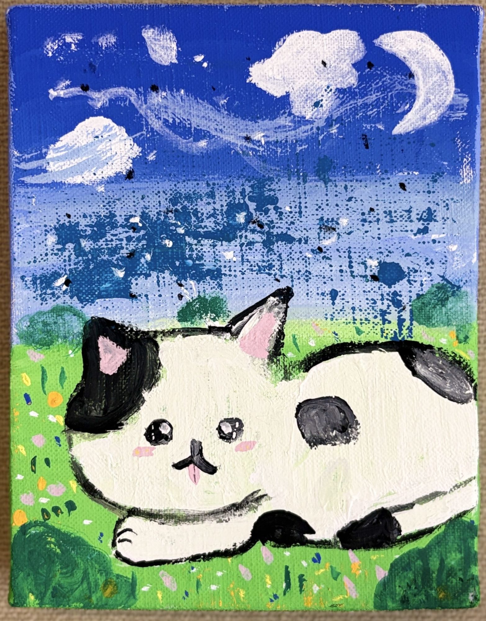 わかめせんせい 先生2025年7月23日 11:25 AM なおさん なんてかわいらしい子ネコでしょう!🐱🌼 のびのびとした野原の中で、ほんわかした表情の子ネコがとても気持ちよさそうに見えます。りんかくもとても丁寧に描けていて、ふわふわした毛の感じが伝わってきますね。 空には月や雲もあって、昼と夜がまざったようなふしぎな雰囲気がとてもステキです🌙☁️✨ 背景の色のにじみや点々も、絵全体にリズムを感じさせてくれて楽しいです。 子ネコの名前をつけるとしたら、どんな名前にしますか?🐾 ログインして返信する ↓
