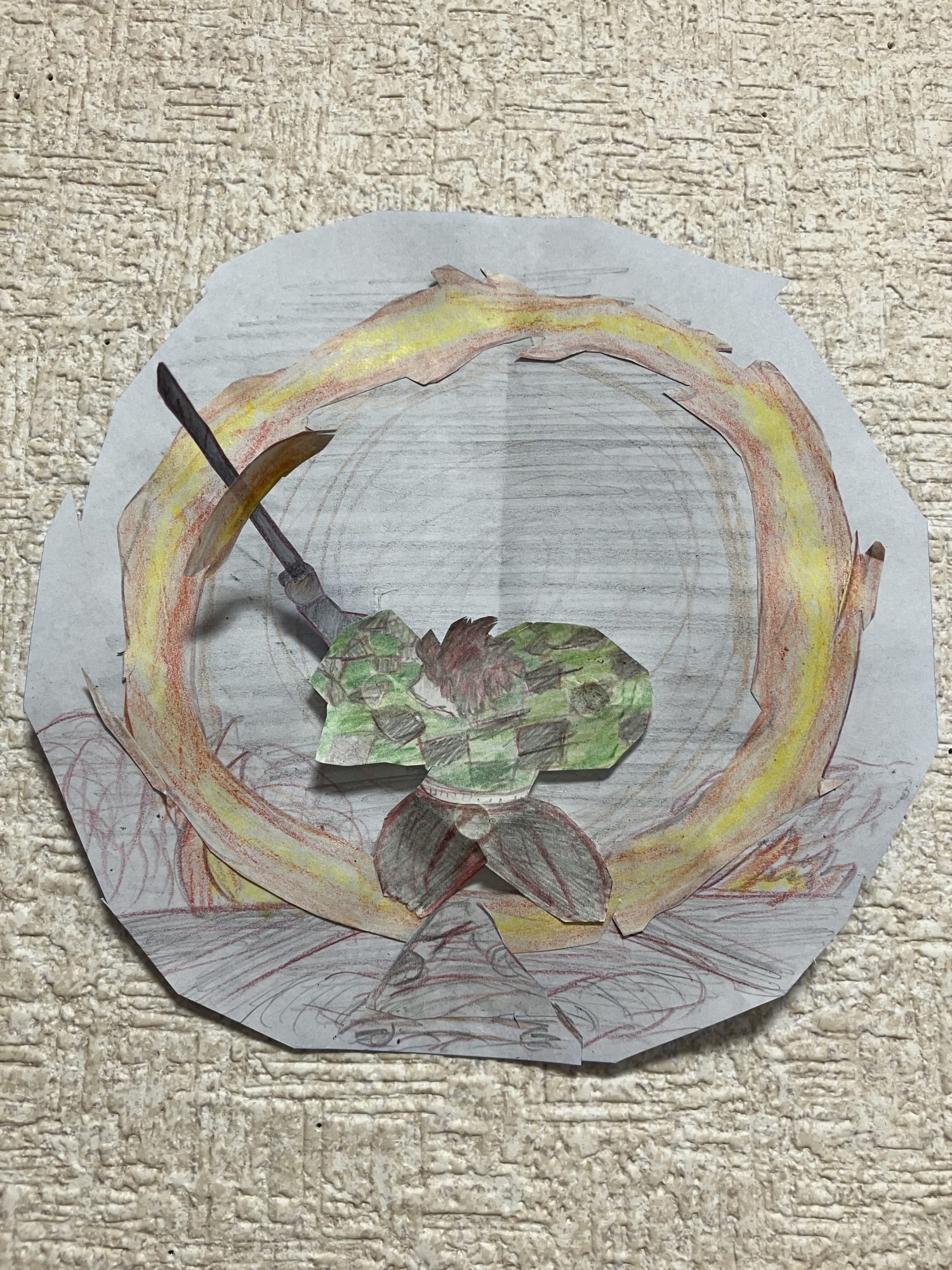 折り紙で立体にしてある工夫がすばらしくて、技のエネルギーが本当にぐるっとまわっているように見えます!人物のポーズも力強くて、技を出す一瞬の集中がしっかり伝わってきました。