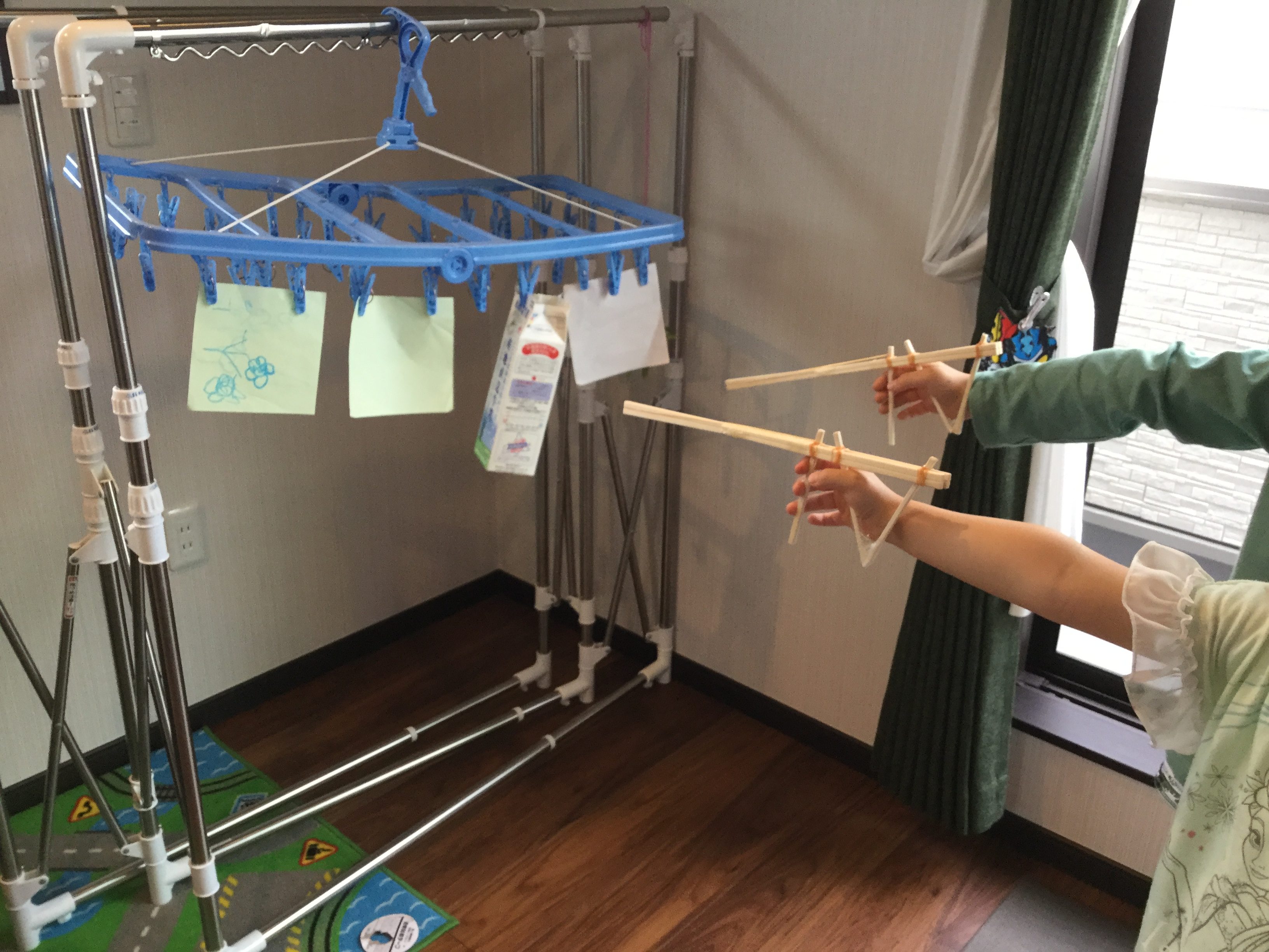 洗濯物を干すこの洗濯ばさみに景品をぶら下げたのが、すごくナイスアイディアですね!
