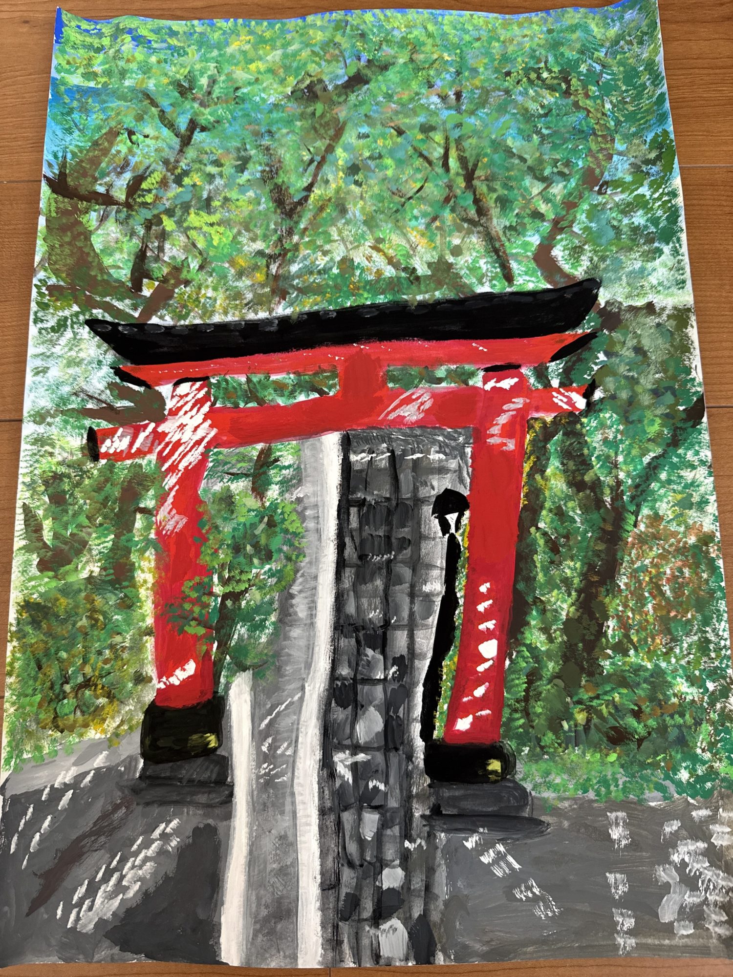 わかめせんせい 先生2025年7月27日 7:55 AM itoさん、「大切な氷川参道」、とても迫力のある作品ですね。 鳥居の大きさと構図のバランスが絶妙で、まっすぐにのびた参道に引きこまれるような感覚になります。堂々とした鳥居が、まるで作品の主人公のように立っていて、itoさんがこの場所を大切に思っている気持ちがしっかり伝わってきました。 背景の葉っぱも、たくさんの色を重ねて工夫されていますね。緑の中に少し黄や茶が混じっていて、木漏れ日のような美しさがあります。色と筆づかいの両方から、自然の豊かさが感じられました。 ここで質問です: 参道の奥にはどんな世界が続いていると思いますか?そこまで歩いたとき、どんな音が聞こえそうですか? ログインして返信する ↓